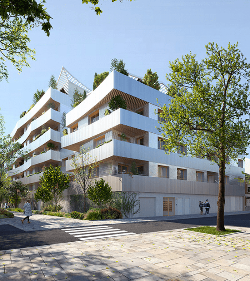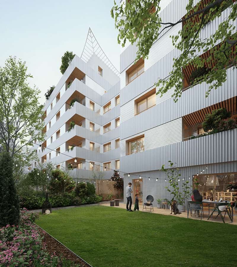 Maîtrise d'ouvrage : Woodeum— Architecte : Nicolas Laisné Architectes — Architecte d'exécution : Innovia — Programme : 85 logements — Adresse : Bagneux (92220) — Surface : 5 700 m² — Montant : 11,5 M€ HT — Statut : Livré en 2024 — Maîtrise d'œuvre : Nicolas Henry, Sophie Darras — Paysagiste : Endroits en Vert — Structure bois : Sylva Conseil — Structure béton : Mo Ingénierie — Fluides, thermique : Bérim — Acoustique : Aïda Acoustique — HQE : Milieu Studio — Économie de la construction : Brogat Associés — Démarche environnementale : Construction bois, BBCA — Crédits Perspectives : ©NICOLAS LAISNE ARCHITECTES