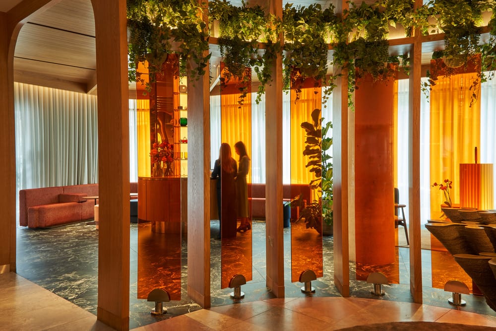 Le hall évoque une véranda contemporaine : lames de bois cintrées, panneaux pivotants en verre ambré, compositions florales et assises confortables invitent à une expérience résidentielle. L’accueil s’efface au profit d’une approche plus informelle, dans un décor façonné par le bois, la lumière et une palette chaleureuse de verts, cognacs et rouges.