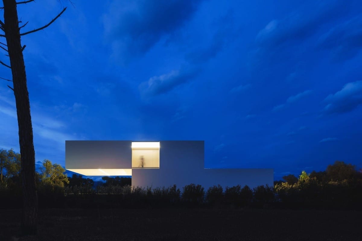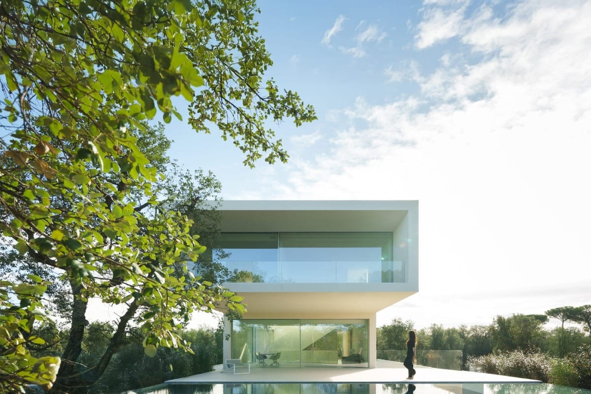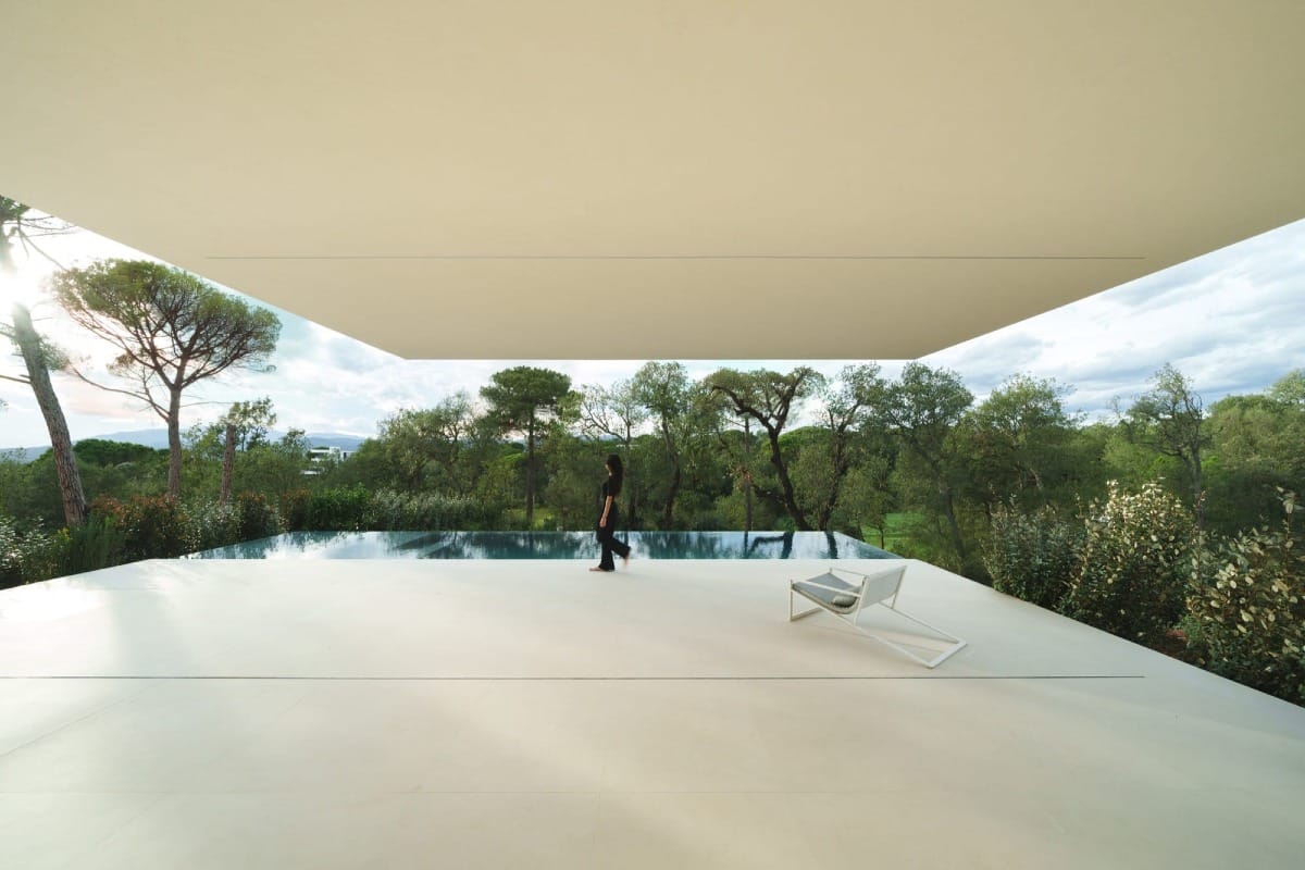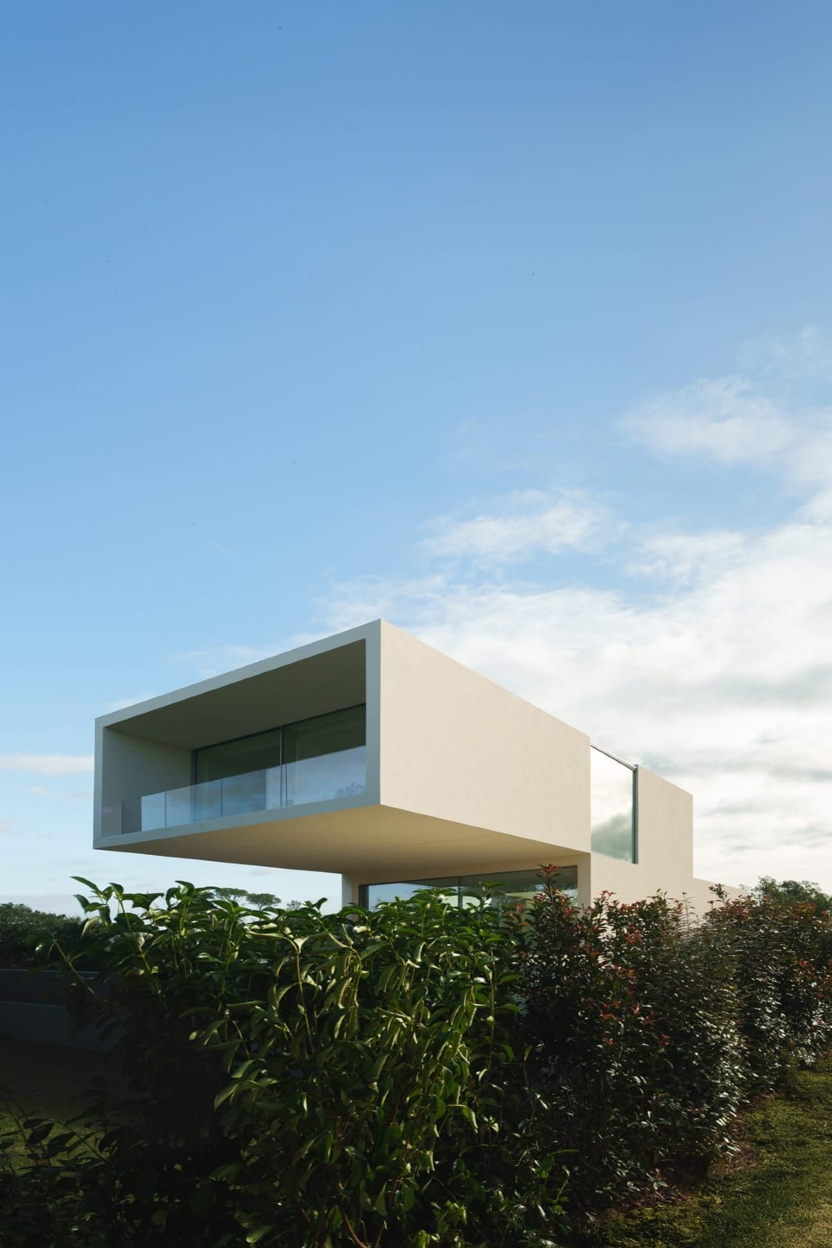 Un volume suspendu de béton blanc dialogue avec le terrain et la lumière, dans une composition minimale et parfaitement maîtrisée.
