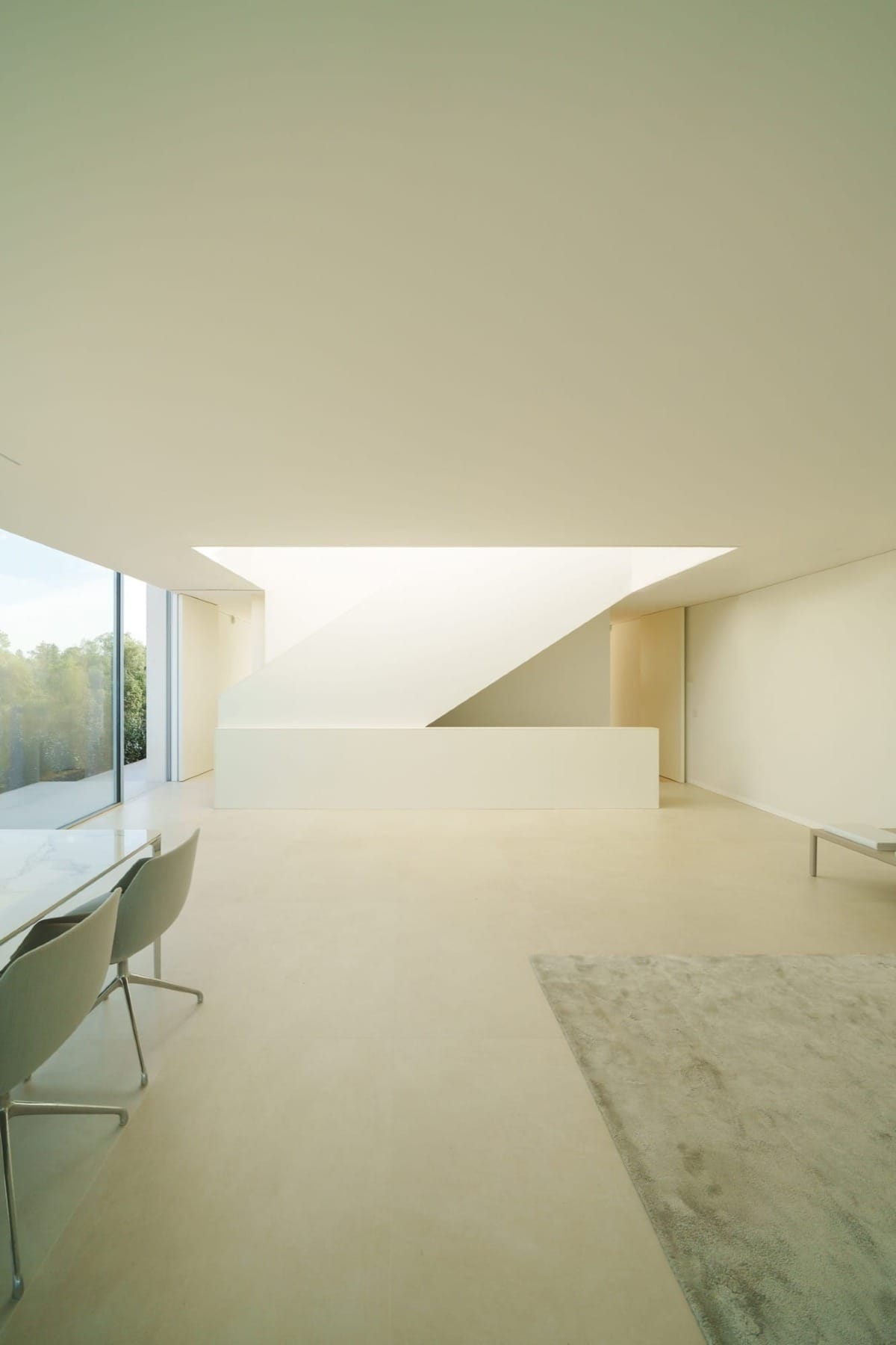 L’ensemble architectural repose sur une composition rigoureuse : deux ouvertures latérales, ponctuelles et précises, signalent les transitions fonctionnelles – l’entrée principale et la suite parentale. À l’intérieur, l’espace s’articule autour d’un vide central qui organise la lumière naturelle sur les trois niveaux. Le traitement des surfaces, volontairement épuré, accentue la continuité des volumes. Le béton, omniprésent, se conjugue à la blancheur des murs pour composer un environnement sobre, structuré et apaisé.