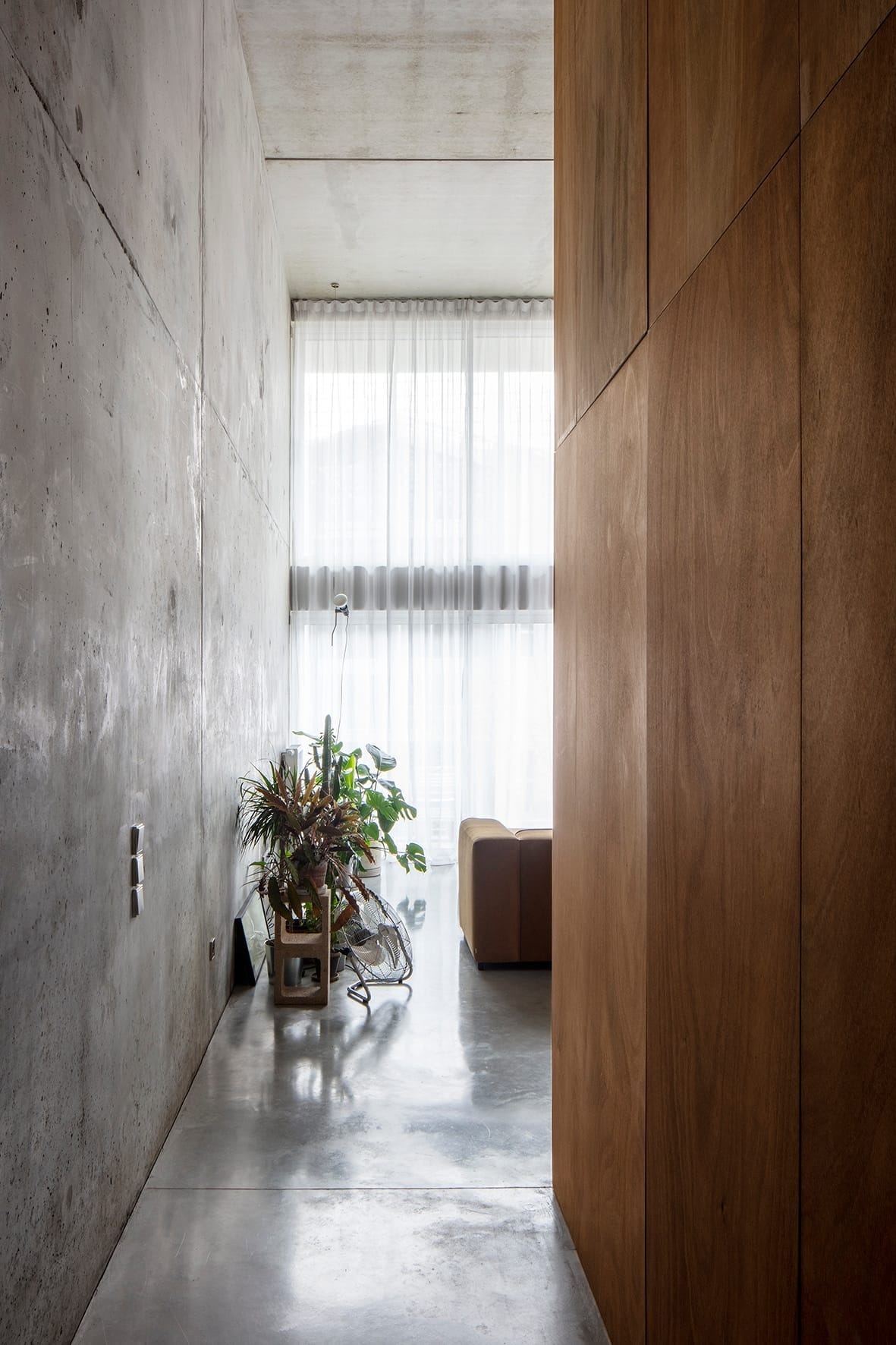 Ici, tout commence par un geste fort : une double hauteur baignée de lumière naturelle, cadrée par un plafond en béton brut et une boîte suspendue en bois d’okoumé.