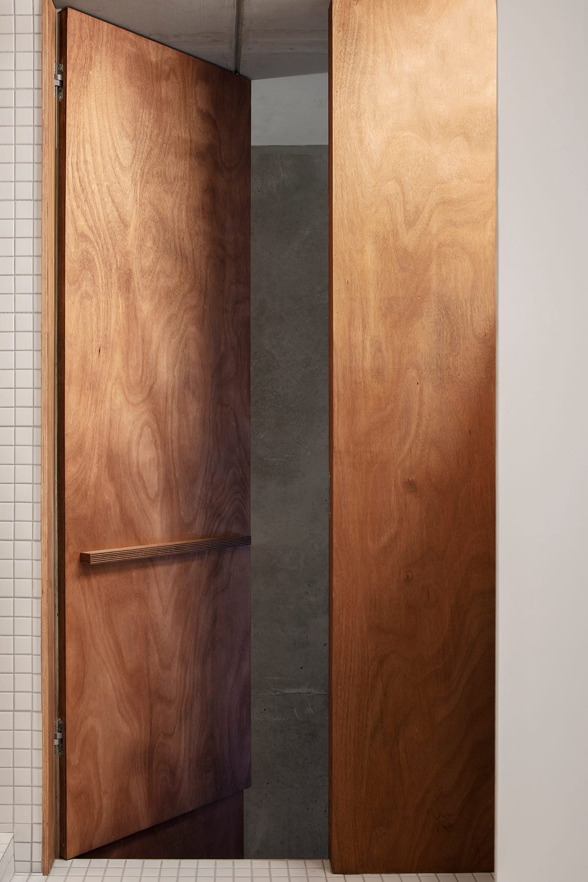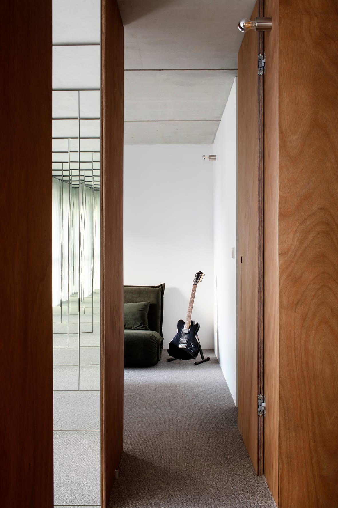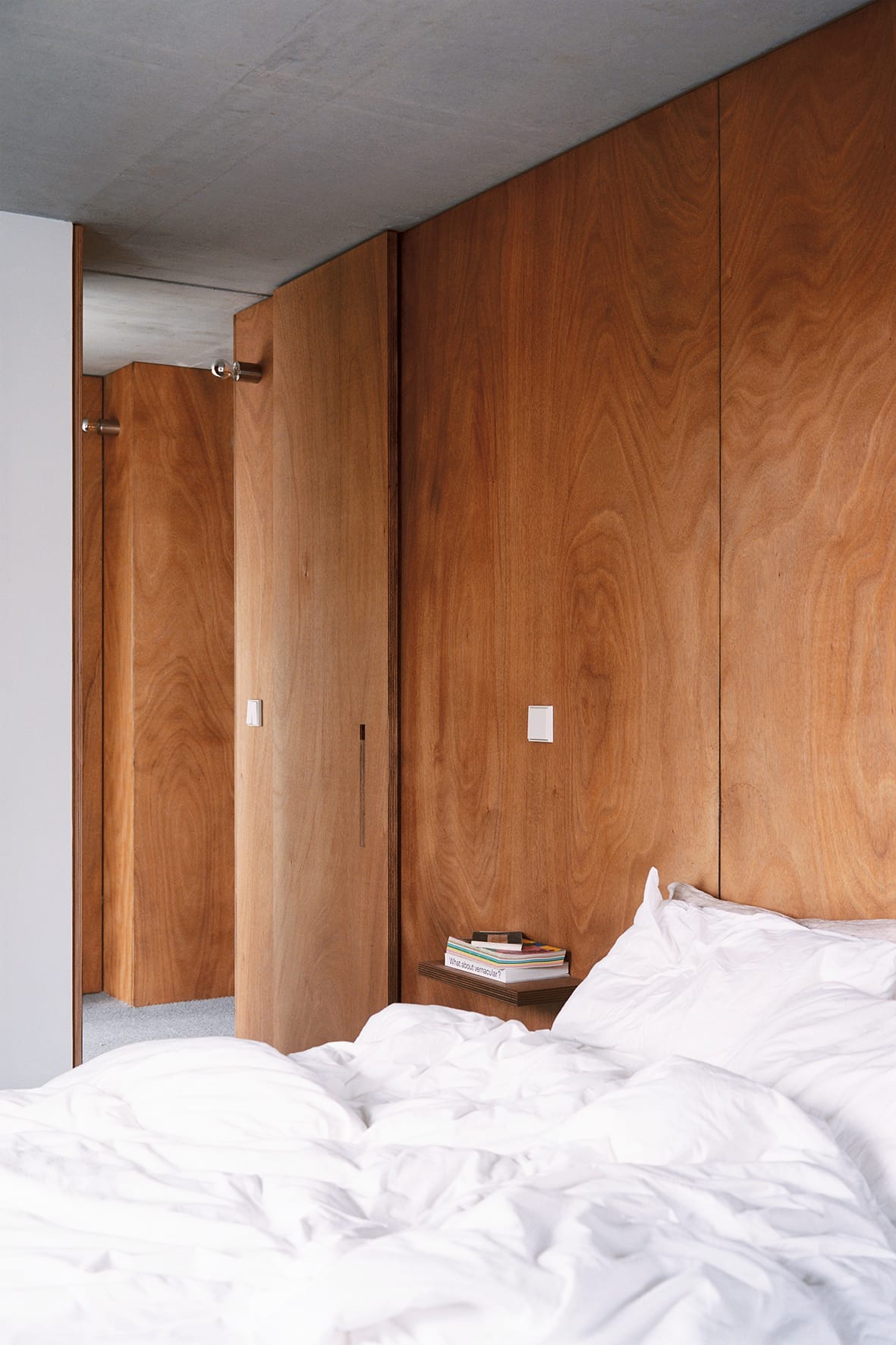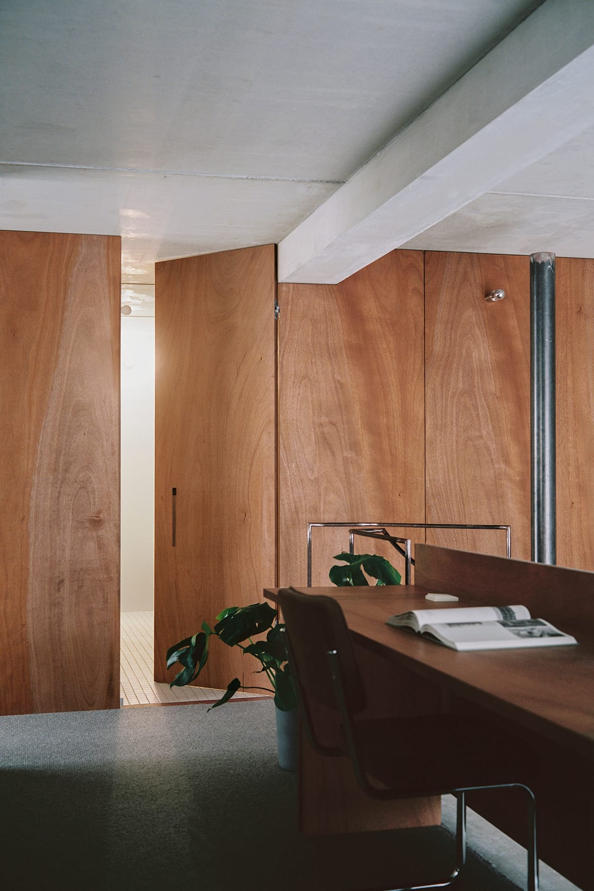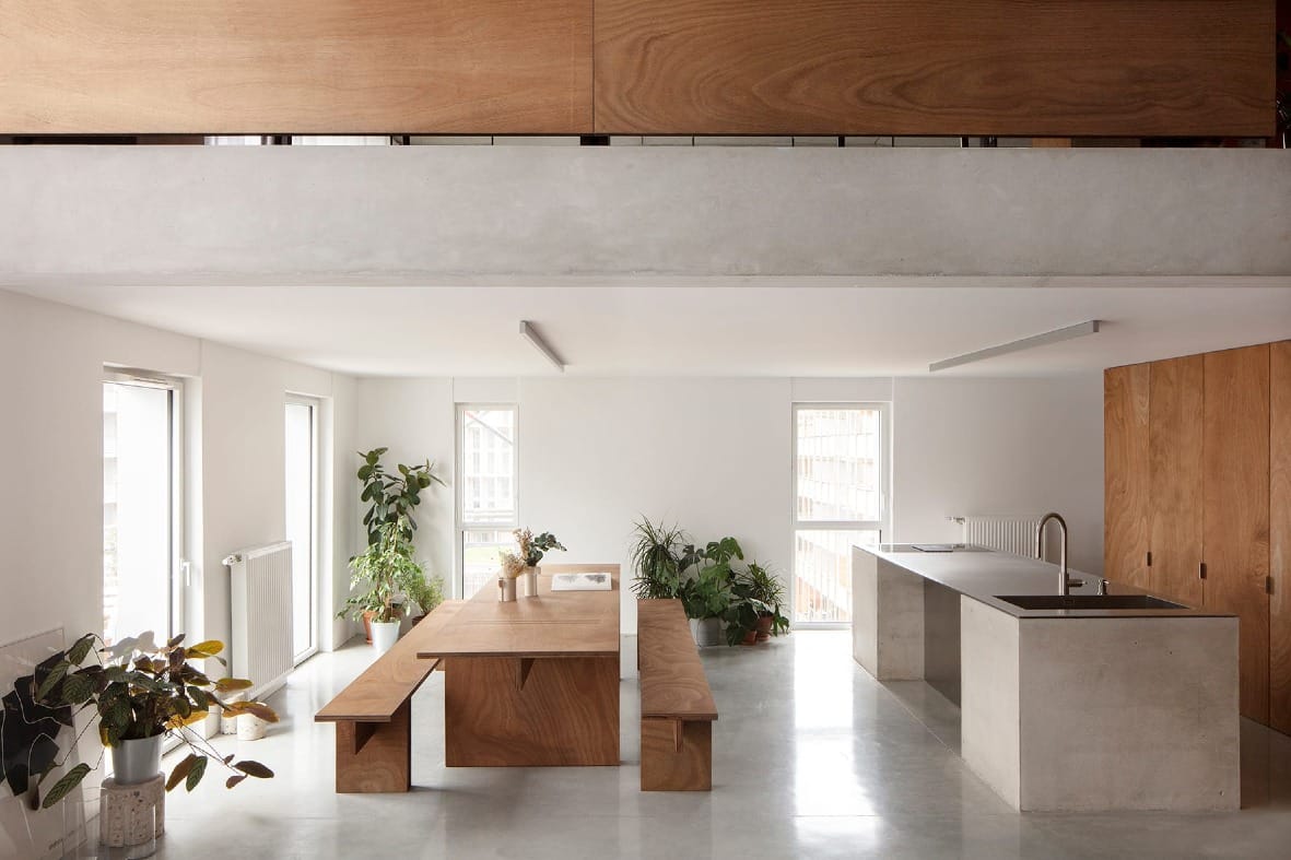 Les pièces de service sont dissimulées dans une paroi bois parfaitement calepinée, tandis que le cœur du logement s’ouvre autour d’une cuisine sculpturale. Deux blocs massifs en béton, coulés sur place, structurent l’espace sans l’alourdir. Le plan de travail en inox reflète la lumière et s’efface, presque abstrait.