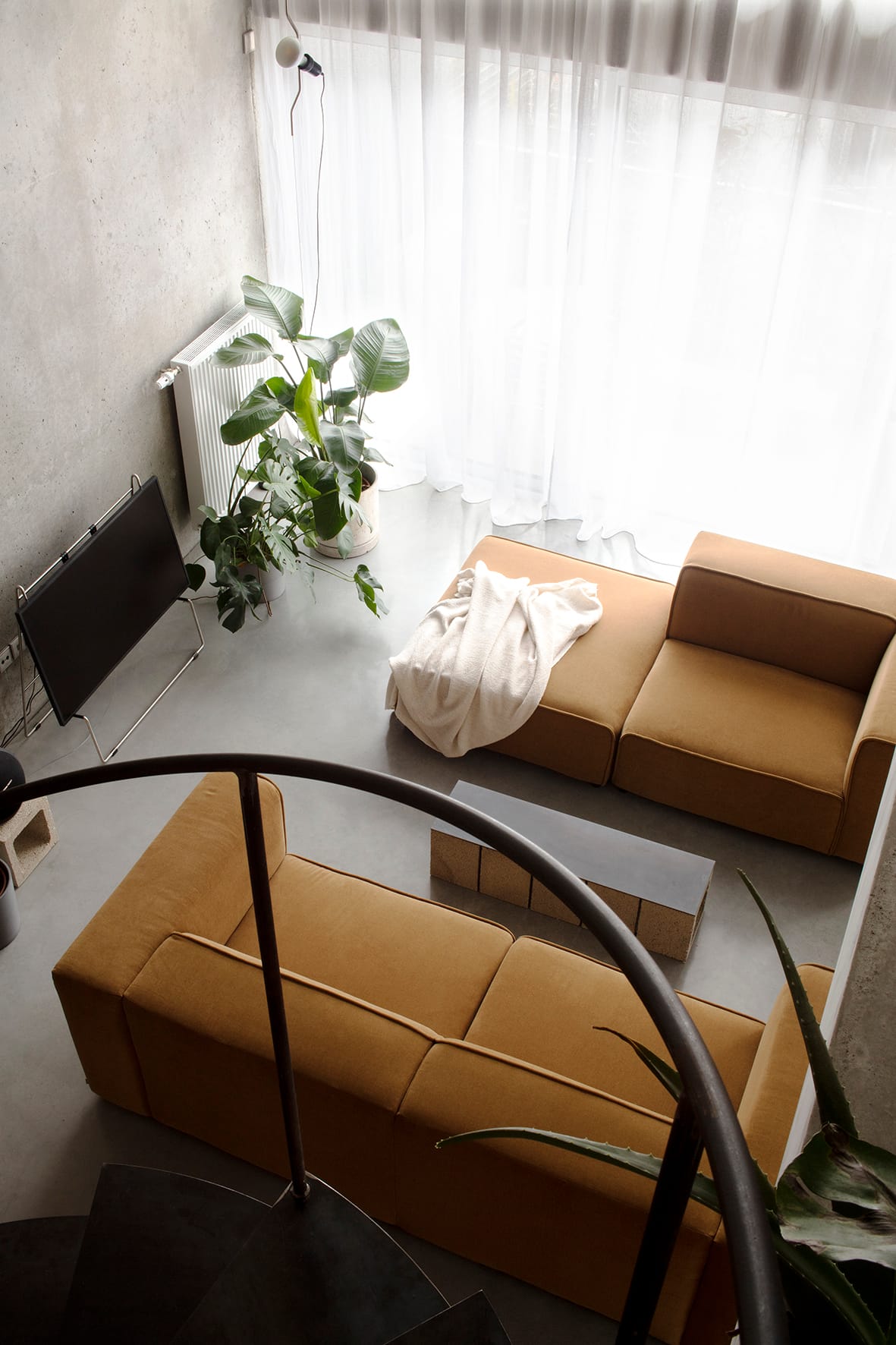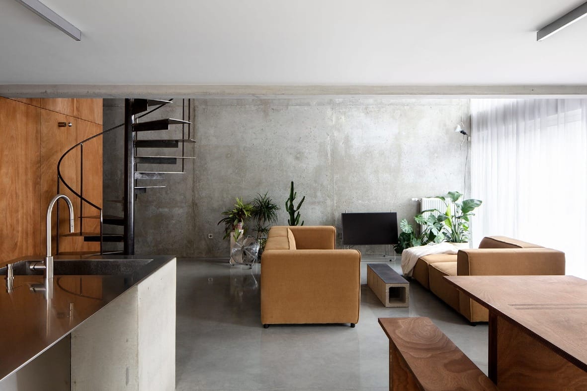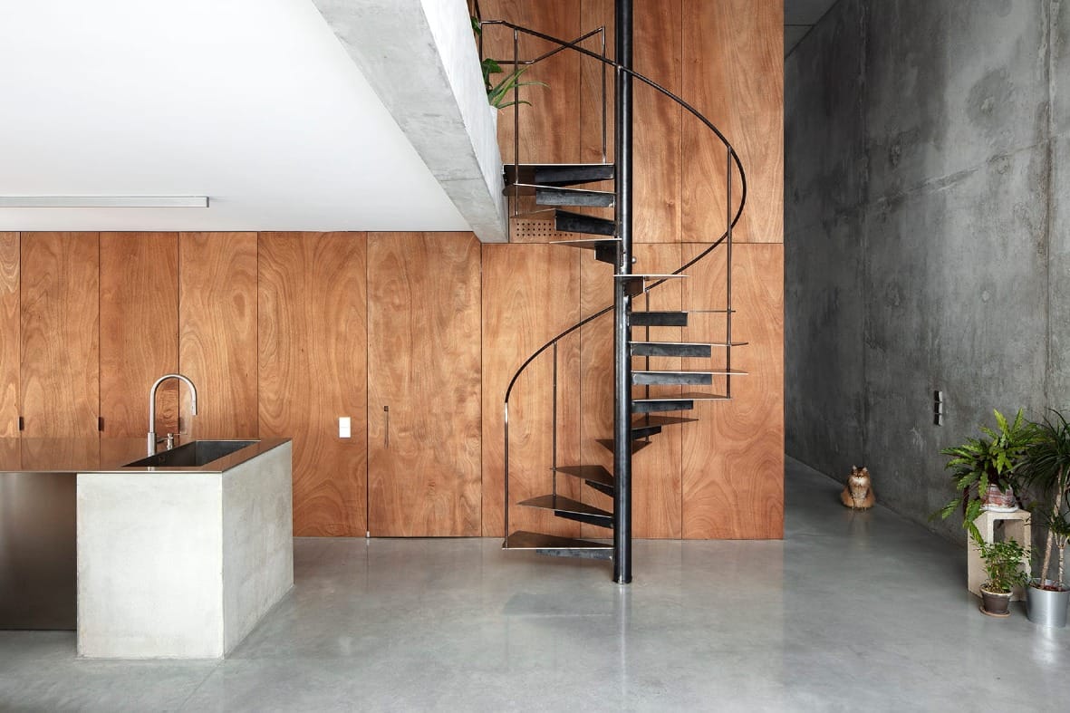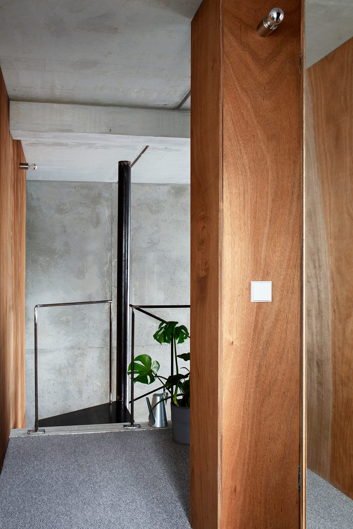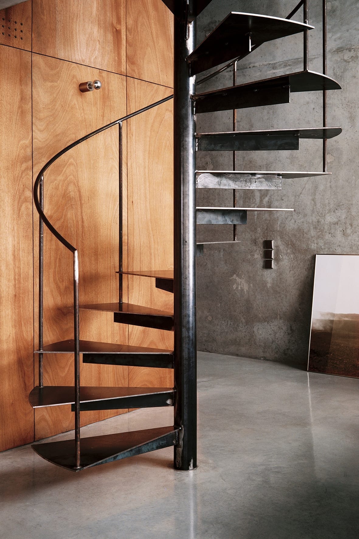 Dans ce duplex, l’escalier relie les étages tout en affirmant sa présence dans l’espace. Élancé, hélicoïdal, façonné en acier brut, il affirme une verticalité douce, un repère dans la maison. Son acier, volontairement laissé nu, s’oxydera lentement – trace tangible de la vie qui s’écoule.