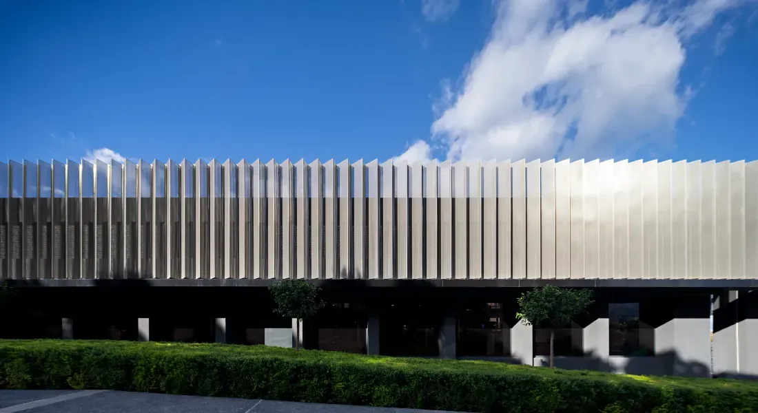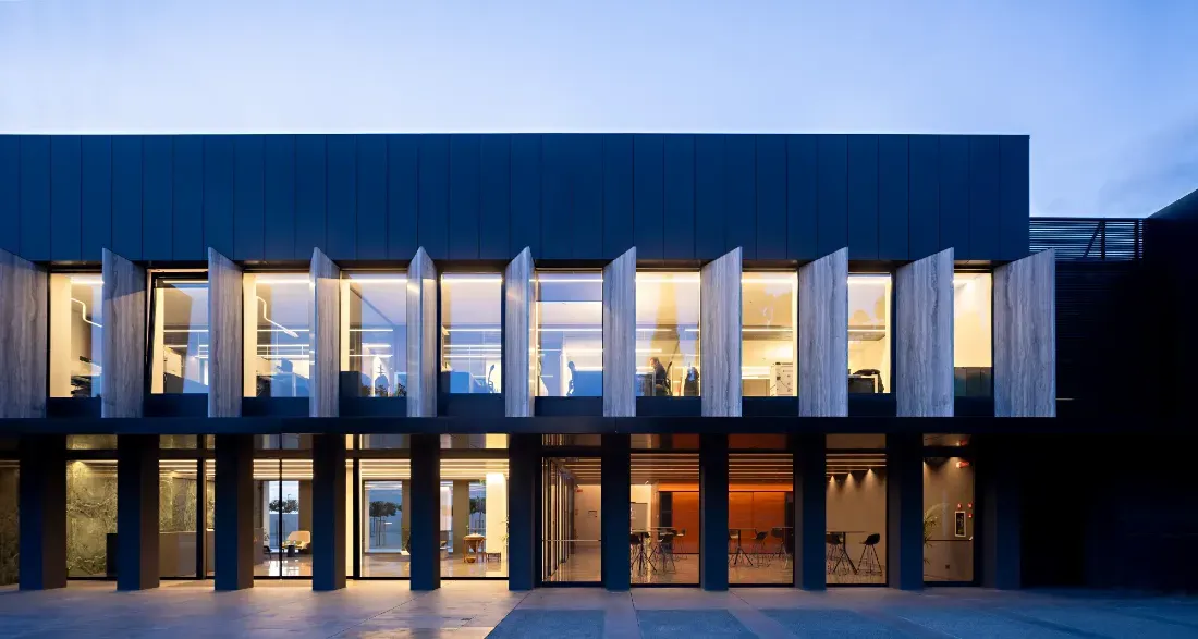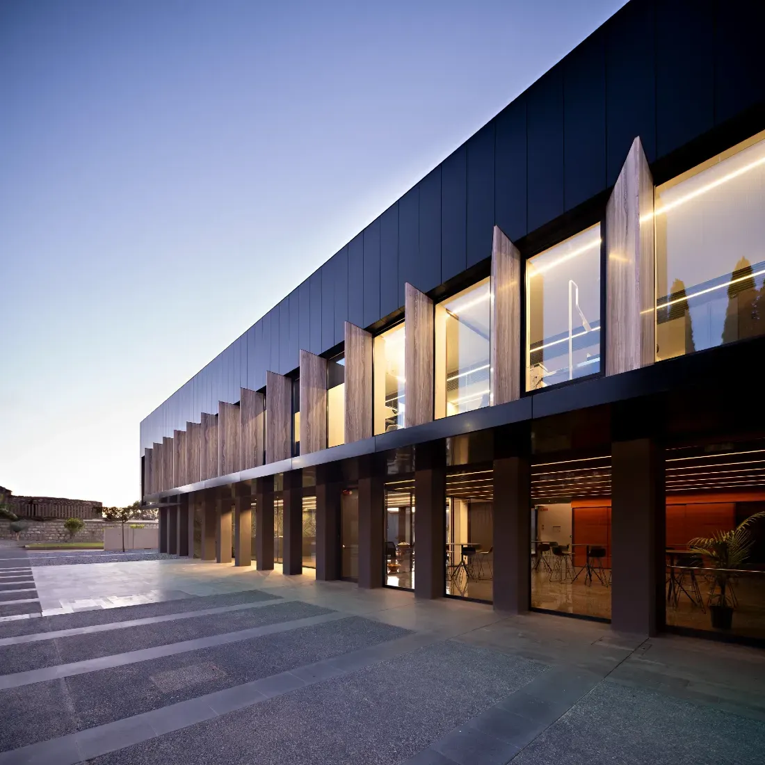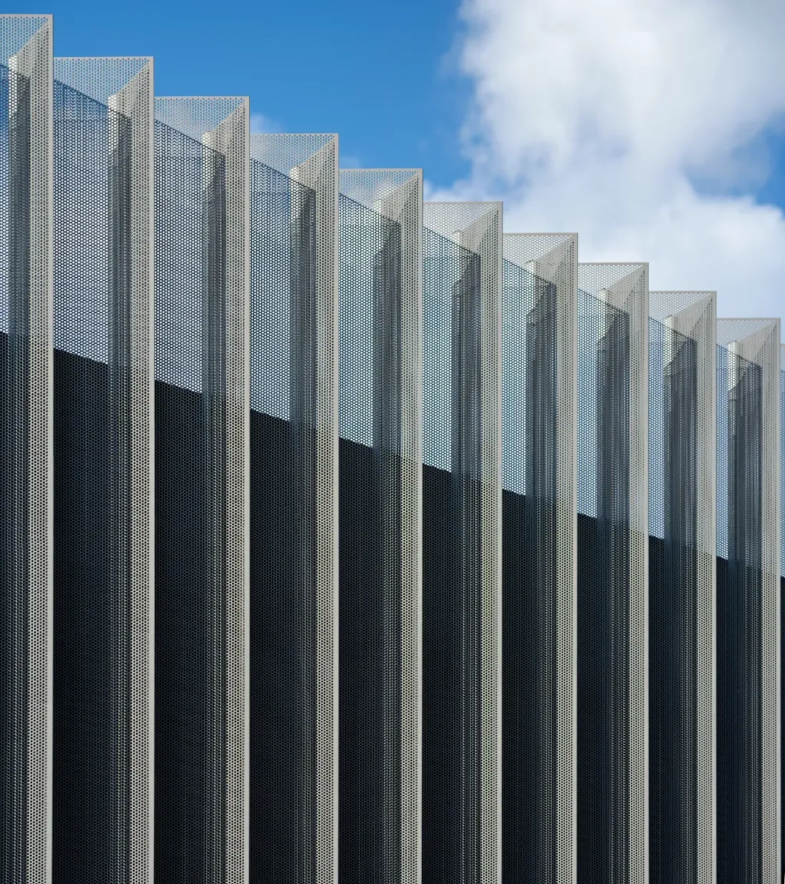 Face à une accumulation désordonnée de volumes techniques, silos et annexes, le projet adopte une stratégie de clarification et d’unification. Une nouvelle enveloppe architecturale, pensée comme un geste enveloppant, vient fédérer les bâtiments existants. Ce système de façades crée une texture vivante où se mêlent basalte, travertin, corten, aluminium et béton, dans une alternance de plans verticaux et de perforations qui modulent les ombres et accompagnent la course du soleil. La façade devient ainsi un outil actif de régulation climatique et de représentation symbolique.