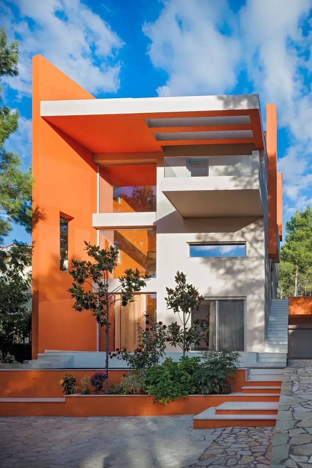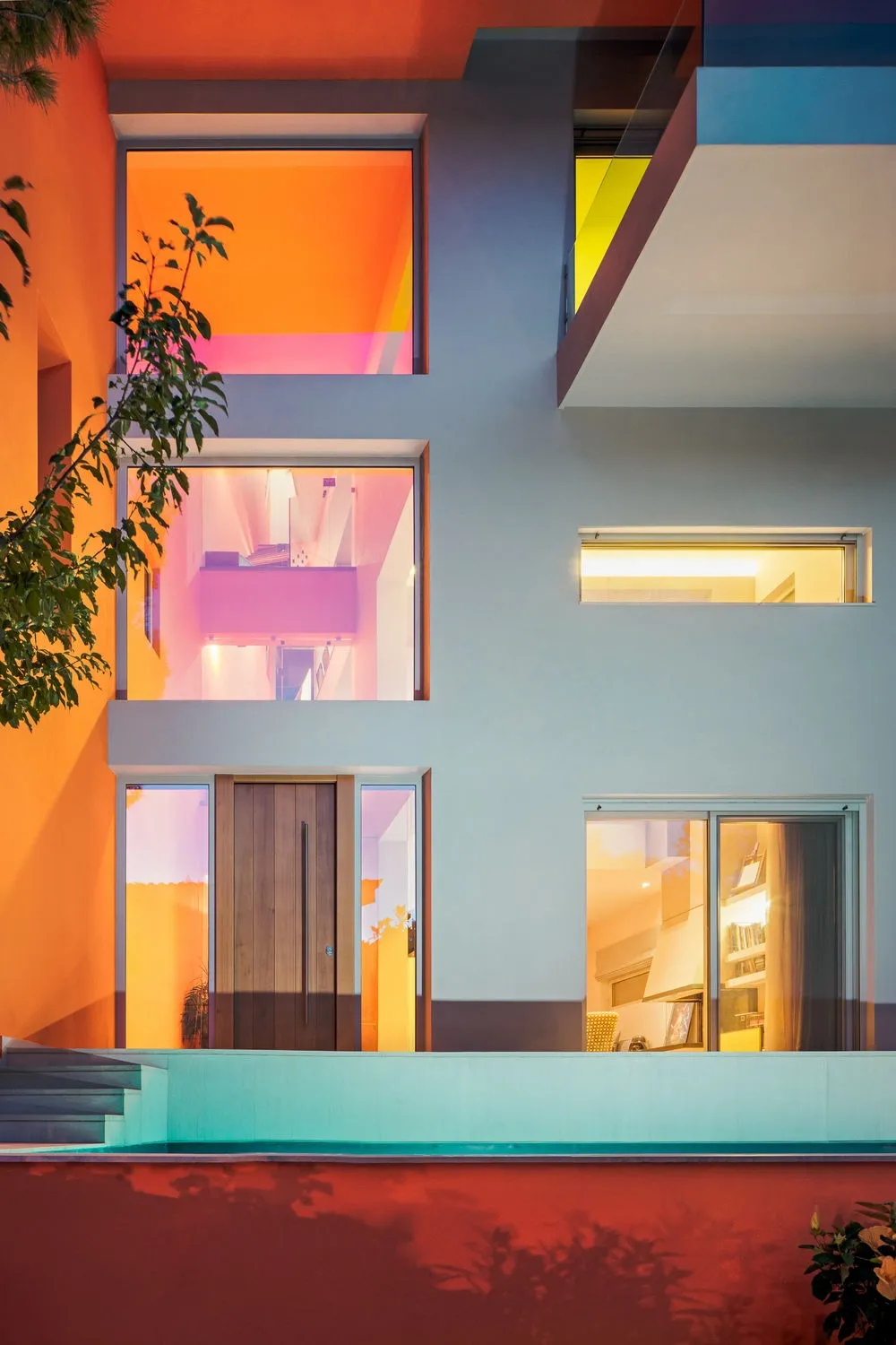 Une maison verticale sculptée par la lumière, où structure, couleur et espace dialoguent au cœur d’un atrium central.