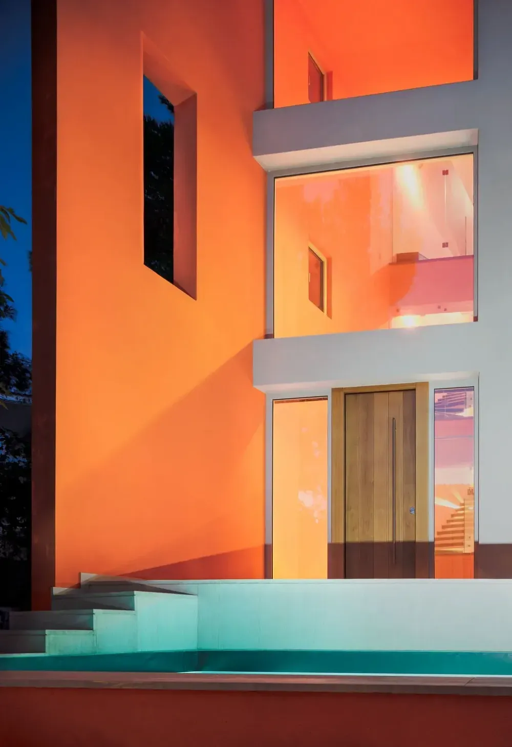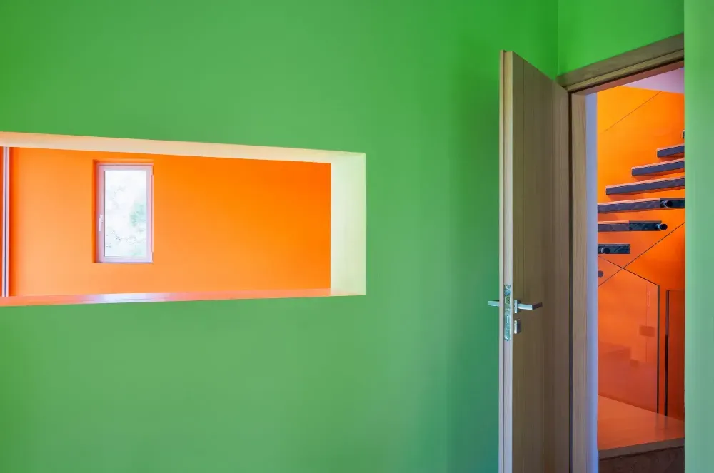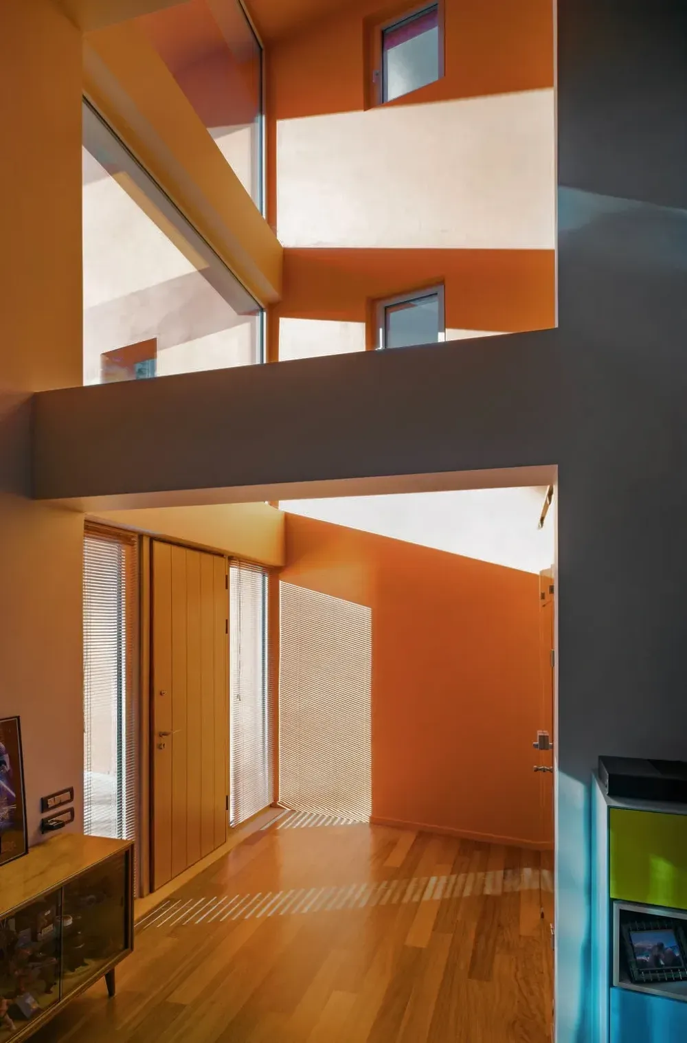 L’ambiance intérieure est marquée par une intervention chromatique assumée. Un mur orange, irradié par une lumière zénithale, traverse les niveaux et agit comme un filtre lumineux, dynamique et chaleureux. Cette présence colorée, conjuguée à la lumière naturelle, transforme le noyau de la maison en un espace de transition expressif et structurant.