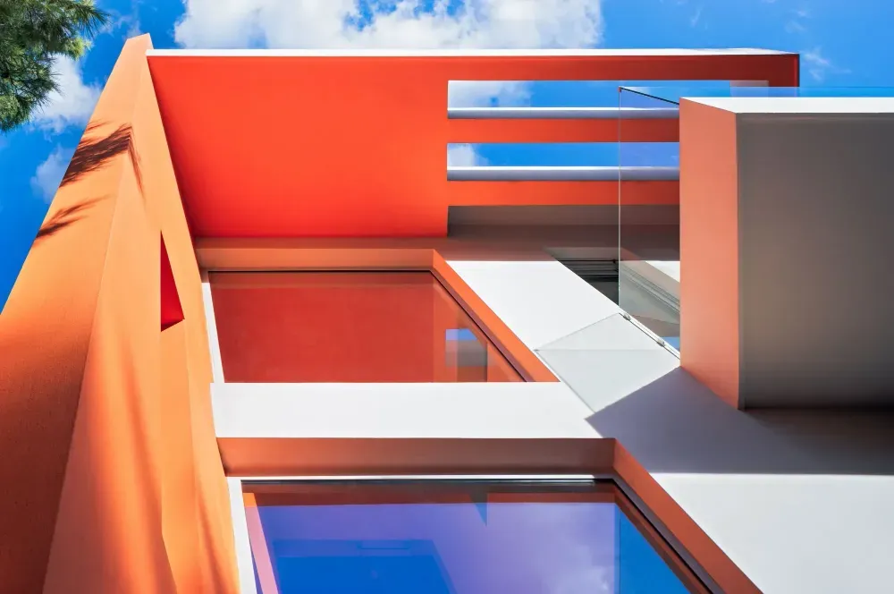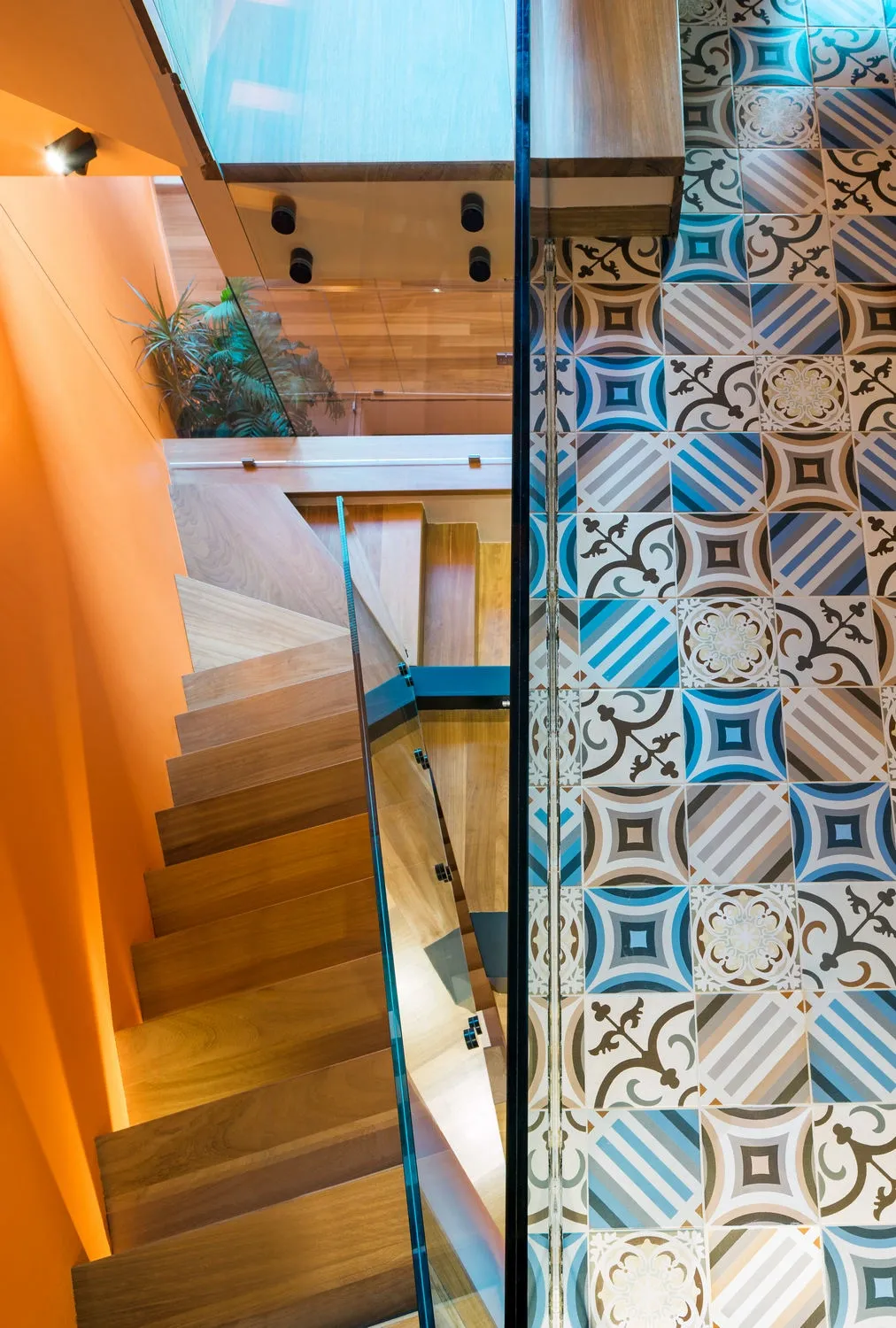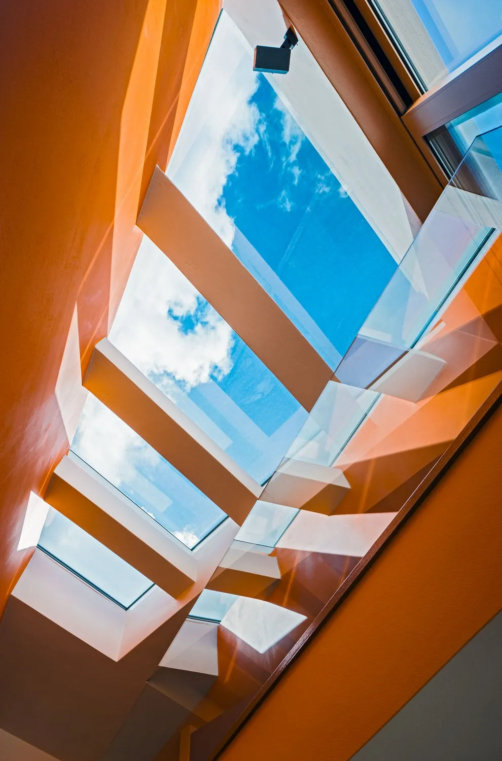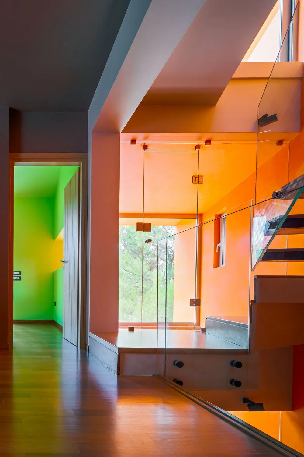 L’ambiance intérieure est marquée par une intervention chromatique assumée. Un mur orange, irradié par une lumière zénithale, traverse les niveaux et agit comme un filtre lumineux, dynamique et chaleureux. Cette présence colorée, conjuguée à la lumière naturelle, transforme le noyau de la maison en un espace de transition expressif et structurant.