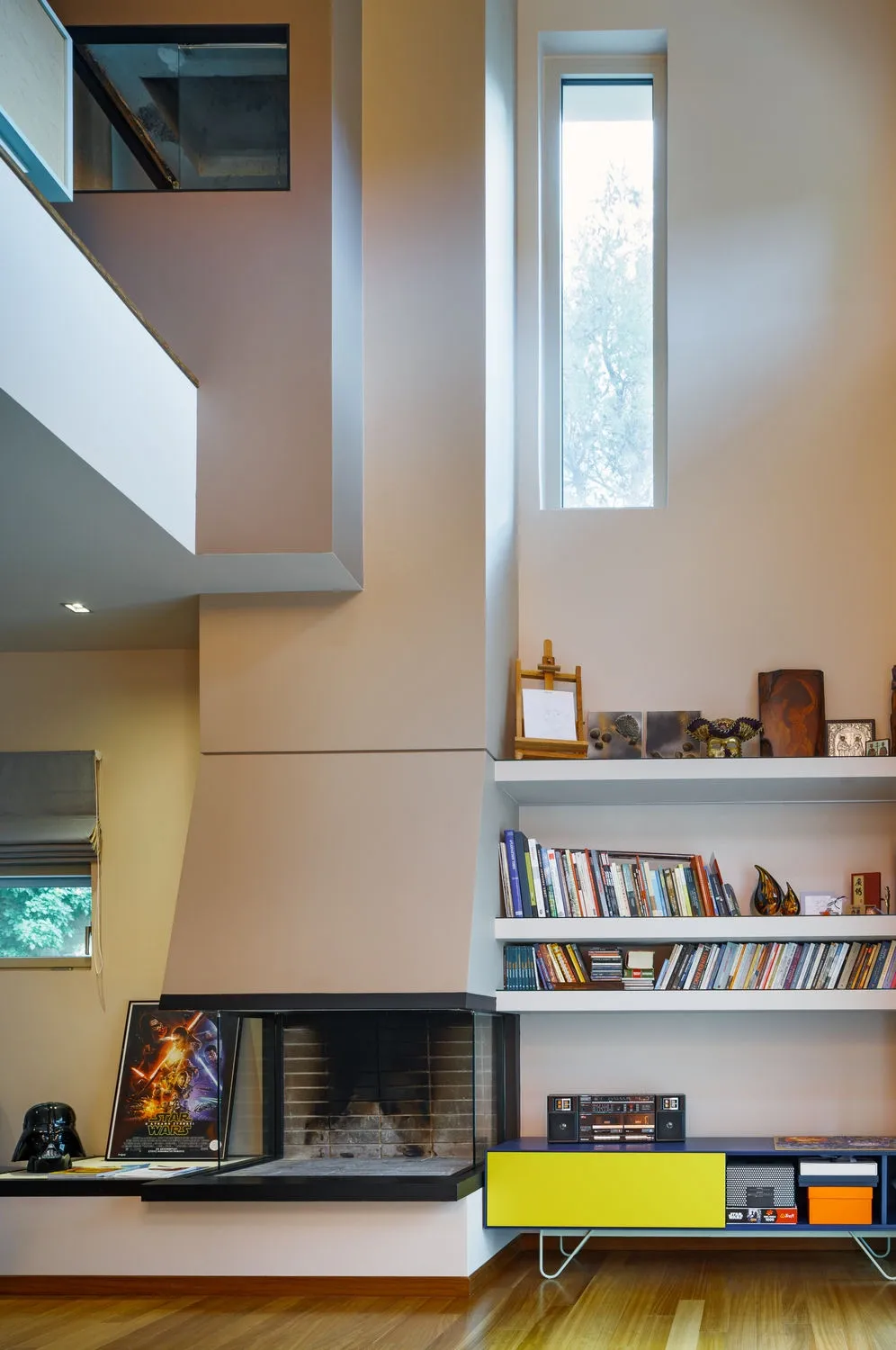 La distribution intérieure s’articule autour d’un vide triangulaire central, véritable colonne vertébrale du projet. Ce volume accueille l’escalier, l’ascenseur et un atrium, tout en structurant la lumière et les perspectives. Le mur nord, légèrement incliné, capte la lumière sud-ouest et oriente les lignes de fuite vers les hauteurs. Ce dispositif spatial renforce la lisibilité verticale de l’ensemble et crée une mise en scène subtile des circulations.
