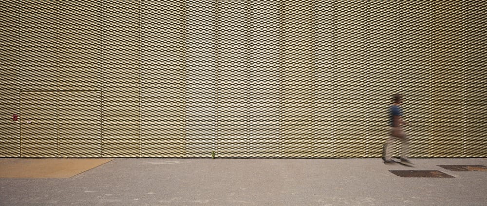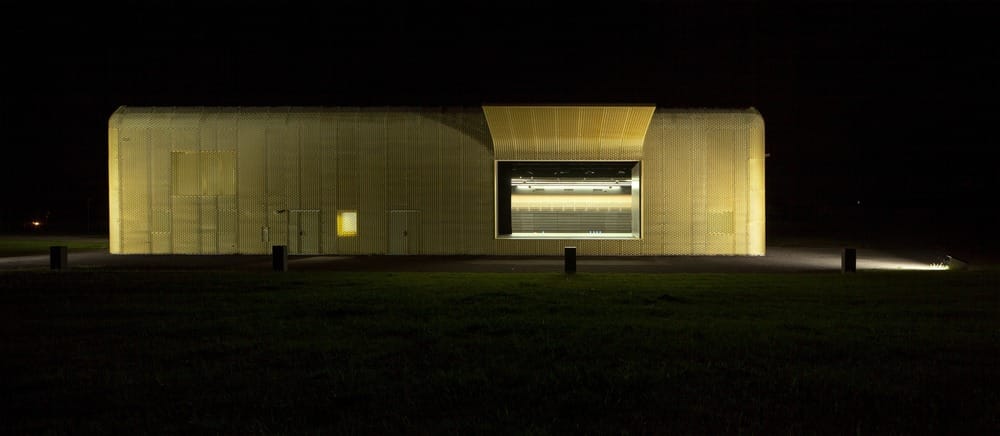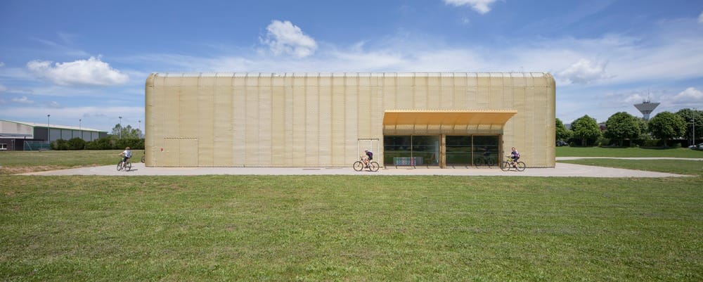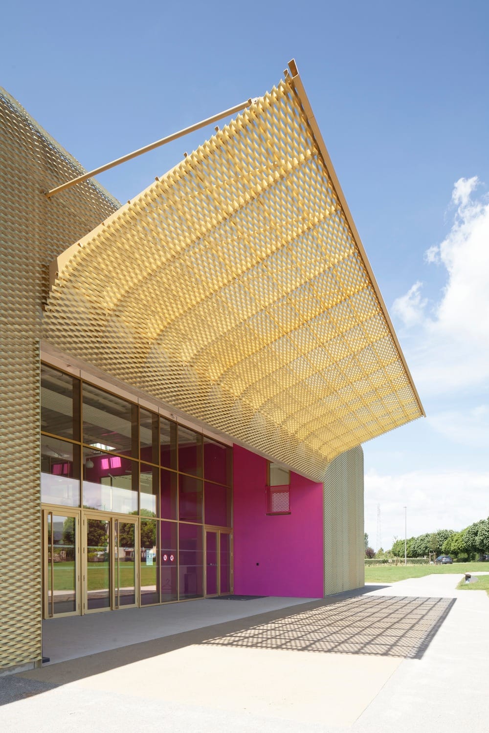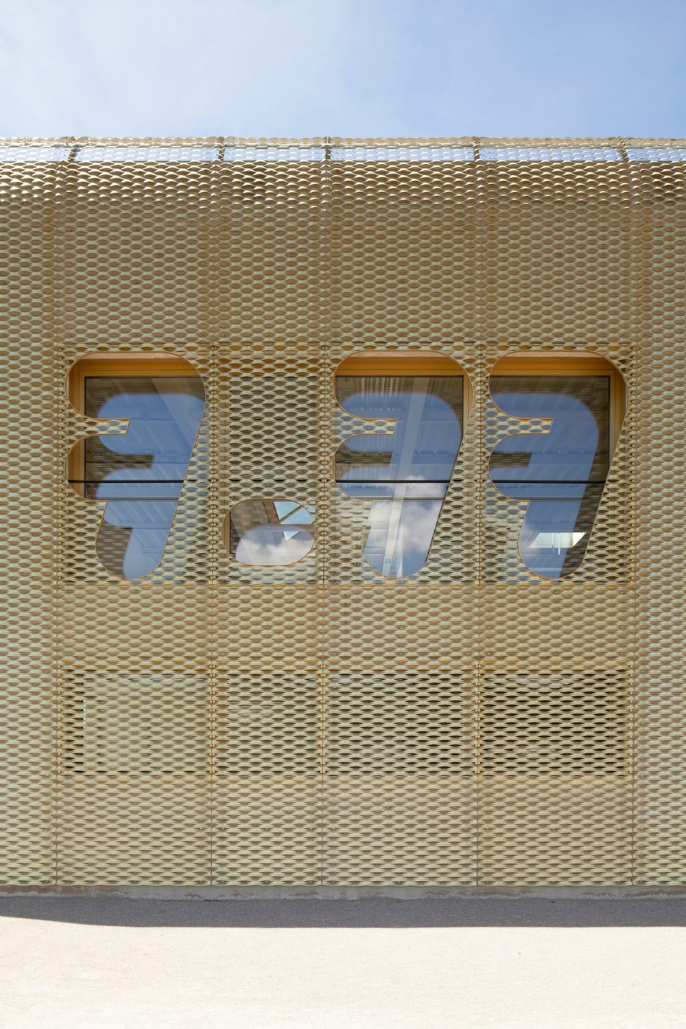 Dans un tissu périurbain hérité des années 1970-1980, la salle multigénérationnelle conçue par CoCo architecture se présente comme un monolithe doré. Compacte et rationnelle, cette enveloppe de 1 000 m² affirme sa présence tout en accueillant des usages variés. L’enveloppe en métal déployé, animée par les variations de lumière, confère à l’édifice une présence dynamique de jour comme de nuit. Percé sur ses quatre façades, le bâtiment établit un lien direct avec les espaces extérieurs paysagers et les équipements sportifs existants. Des auvents permettent d’étendre les usages à l’extérieur, en cohérence avec les différentes fonctions accueillies.