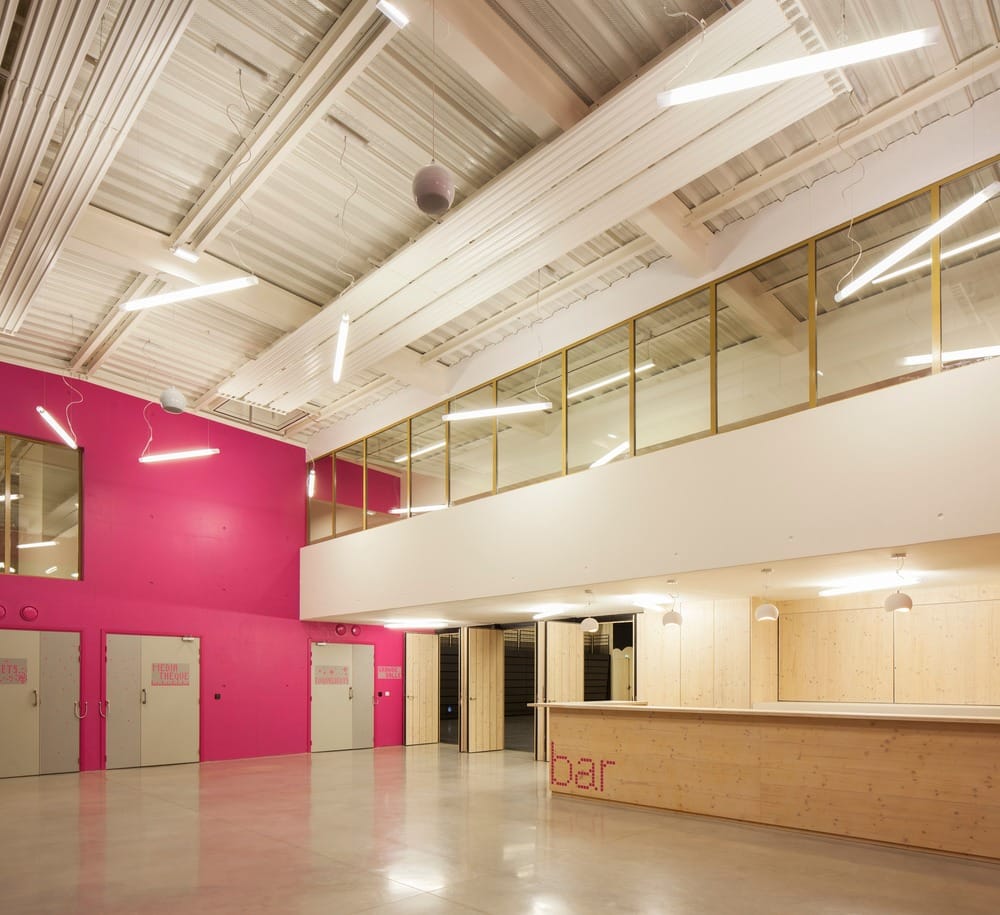 À l’intérieur, les choix économiques ont dicté un langage brut mais soigné : structure apparente peinte en blanc, murs lasurés rose, éléments techniques visibles, plafond absorbant en bois découpé en nuages pour optimiser l’acoustique.
