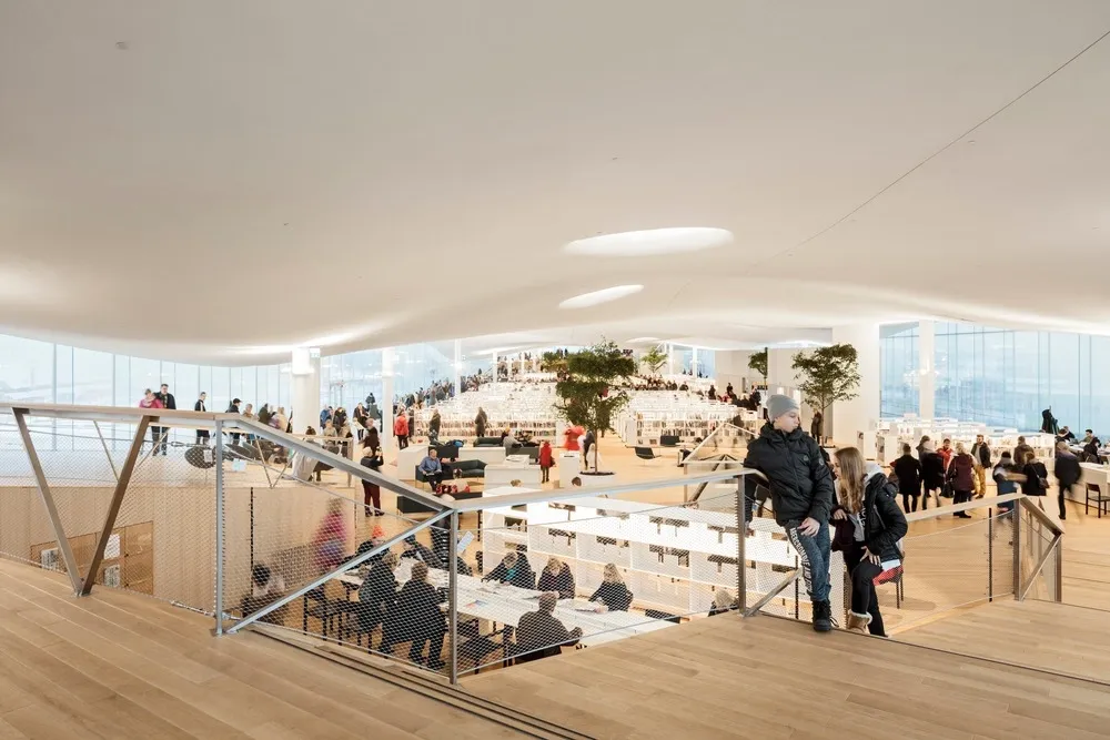 Le bâtiment s’organise en trois niveaux distincts. Le socle, largement ouvert sur la ville, prolonge la place Kansalaistori dans un espace libre de tout appui, abrité sous un auvent sculptural en bois. Cette figure d’appel, à la fois technique et symbolique, fait d’Oodi un espace poreux, pensé pour accueillir événements, déambulations et usages informels. Au-dessus, le volume intermédiaire accueille des fonctions plus spécifiques : studios, salles de montage, espaces de travail et atelier de fabrication équipé. L’ensemble se love entre les fermes structurelles d’un pont habité de 100 mètres de long.