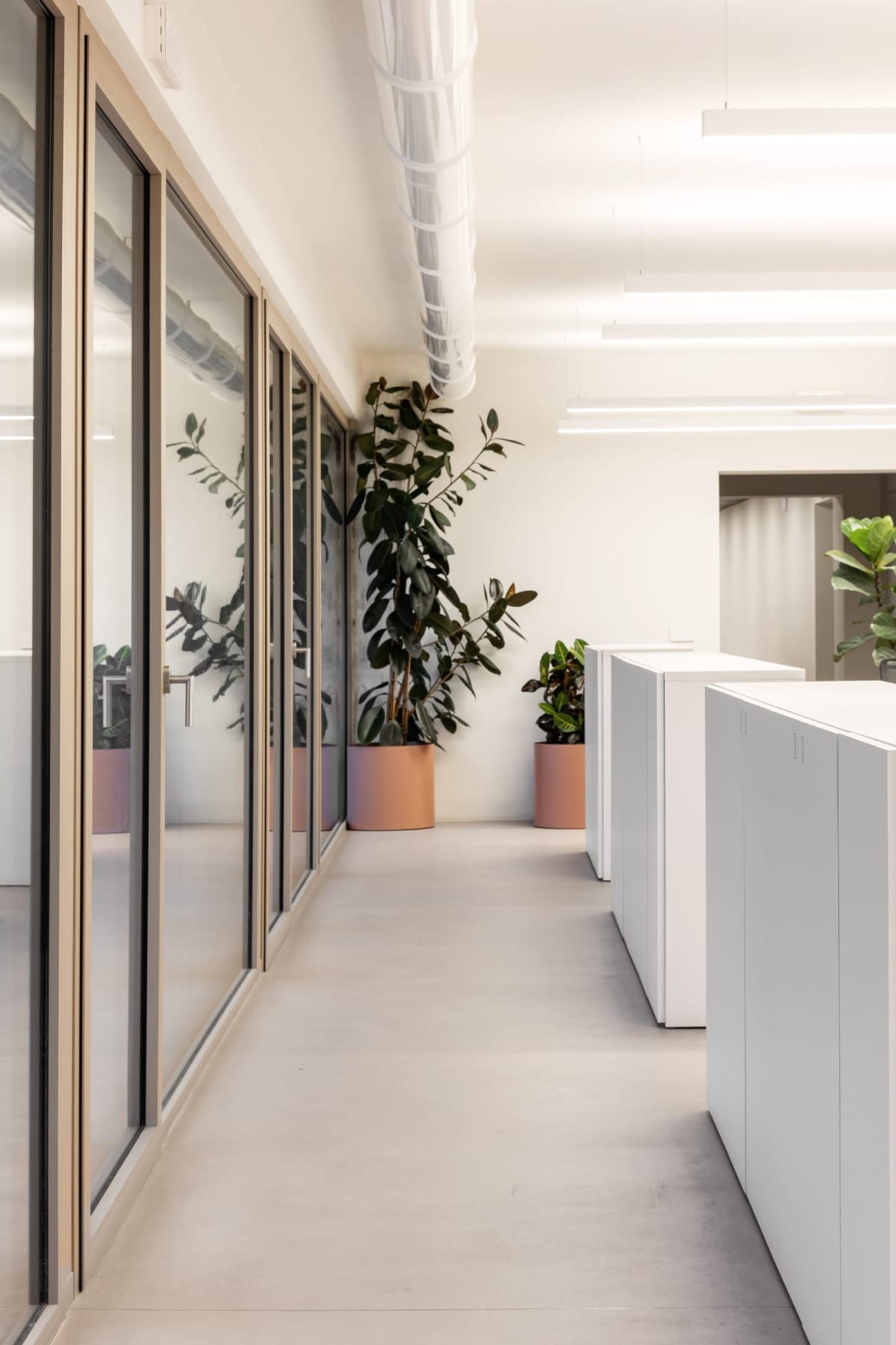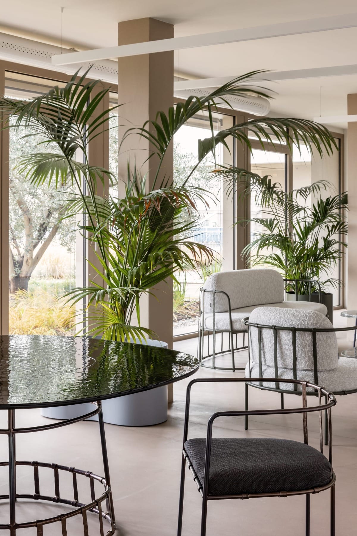 L’intervention privilégie l’ouverture et la lumière. Les façades, autrefois hermétiques, sont percées de grandes baies vitrées qui prolongent les espaces de travail vers des terrasses végétalisées. À l’intérieur, les plateaux sont décloisonnés, dans une ambiance sobre et apaisée. Le béton apparent dialogue avec des éléments textiles, du mobilier épuré et des rideaux filtrants qui modulent lumière et confidentialité.