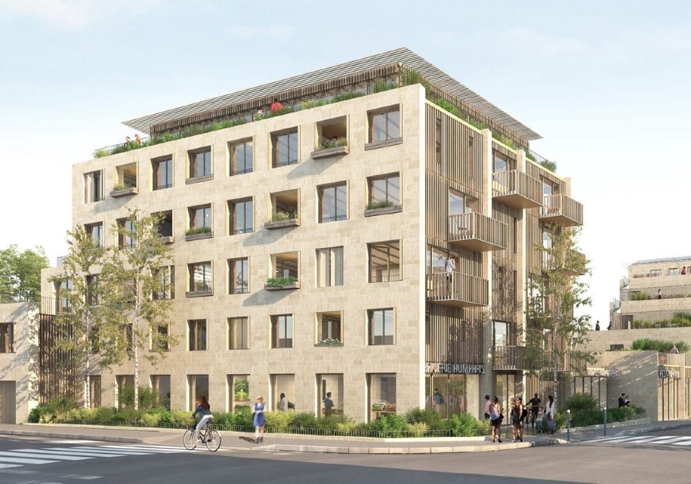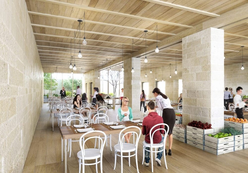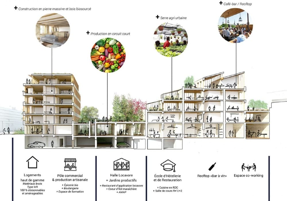 Les façades épurées et les volumes équilibrés favorisent la fluidité entre espaces publics et privés, tandis que les terrasses productives et toitures végétalisées enrichissent les usages en intégrant détente et agriculture urbaine. Le projet accueille une école hôtelière et de restauration avec son restaurant d’application, une halle locavore, des commerces en rez-de-chaussée et 17 logements modulables.