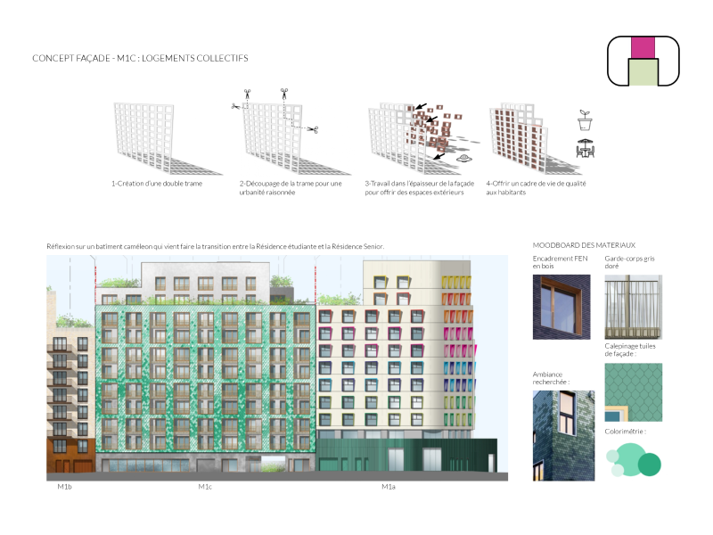 Le projet M1C pour logements collectifs est centré sur quatre axes principaux pour améliorer l'intégration urbaine et la qualité de vie résidentielle. La façade utilise une double trame structurelle pour un découpage précis, améliorant ainsi l'urbanité du bâtiment. L'épaisseur de la façade est exploitée pour créer des espaces extérieurs fonctionnels. Les matériaux choisis, comme l'encadrement en bois FEN et les garde-corps gris doré, sont sélectionnés pour leur durabilité et leur esthétique, tout en respectant les normes de sécurité. Le calepinage des tuiles de façade est soigneusement planifié pour contribuer à une esthétique cohérente et moderne. Ce bâtiment fonctionne comme une entité caméléon, assurant une transition fluide entre les espaces pour étudiants et seniors.