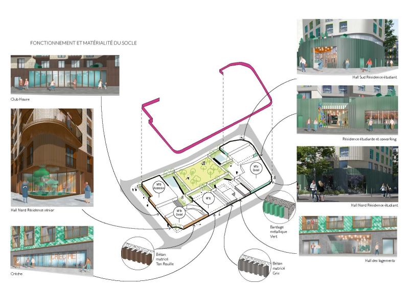Le socle du bâtiment est optimisé pour faciliter la circulation et l'interaction des résidents, intégrant des zones clés comme le Club House, le Hall Nord et une Crèche. Les matériaux principaux utilisés, Béton matricé Ton Rouille, Bardage métallique Vert et Béton matricé Gris, sont choisis pour leur durabilité et leur intégration esthétique. Le béton matricé offre une finition texturée durable tandis que le bardage métallique ajoute une touche moderne tout en protégeant contre les intempéries. Cette combinaison matérialise un socle fonctionnel et accueillant, répondant aux exigences techniques et esthétiques du projet.