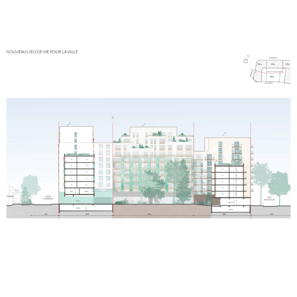 - Socle Vivant : Ce niveau de base offre une alternance dynamique d’espaces intérieurs et extérieurs habités, intégrant des installations telles que Crèche, Club House, et espace de Co-working. Cette configuration favorise l'interaction communautaire et une intégration sociale accrue au sein du bâtiment.