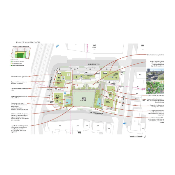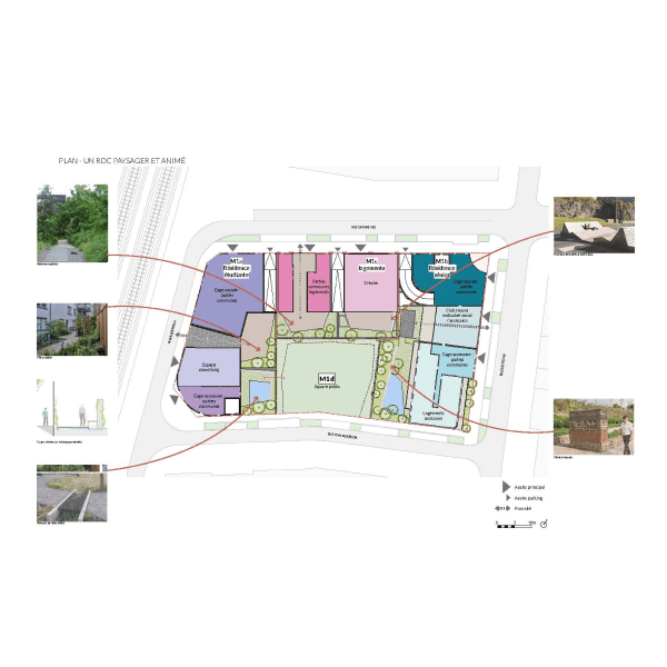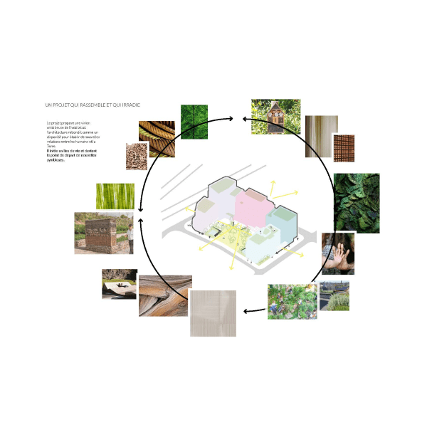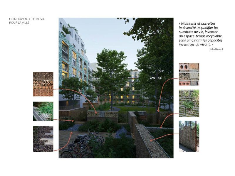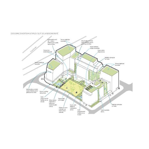 Ce projet représente une conception d'espaces urbains durables, offrant un cadre de vie novateur qui intègre la nature et la communauté au cœur de la ville. Les éléments architecturaux tels que les jardins partagés, allées piétonnes, et zones de repos communales sont conçus pour encourager l'interaction et la biodiversité urbaine. L'utilisation de matériaux naturels et recyclables comme le bois pour les chemins et les constructions mineures, ainsi que l'intégration de systèmes de nidification pour la faune locale, soulignent l'engagement du projet envers la durabilité environnementale. Ces espaces verts sont non seulement esthétiques mais fonctionnels, favorisant un microclimat plus sain et une meilleure qualité de vie pour tous les résidents.