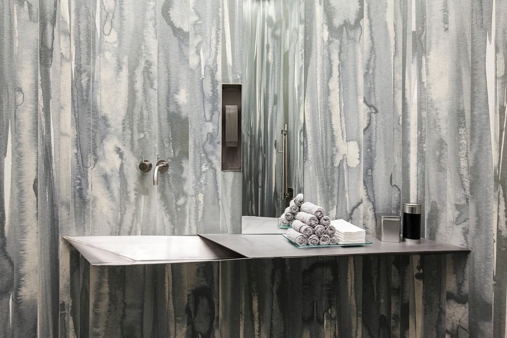 Le point de départ du projet réside dans une aquarelle originale, créée par RCR et Pau Llimona, déclinée sur l’ensemble des parois, plans de travail, mobiliers et éléments techniques du restaurant. Ce motif pictural, complexe et fluide, a été transposé sur les dalles Neolith® grâce à une technologie d’impression numérique haute définition (NDD), spécialement adaptée pour ce projet. Le défi fut autant technique qu’esthétique : préserver la fidélité du dessin initial à l’échelle architecturale, dans des teintes rares de bleus et verts, tout en respectant les exigences de texture et de résistance propres à un lieu de restauration haut de gamme.