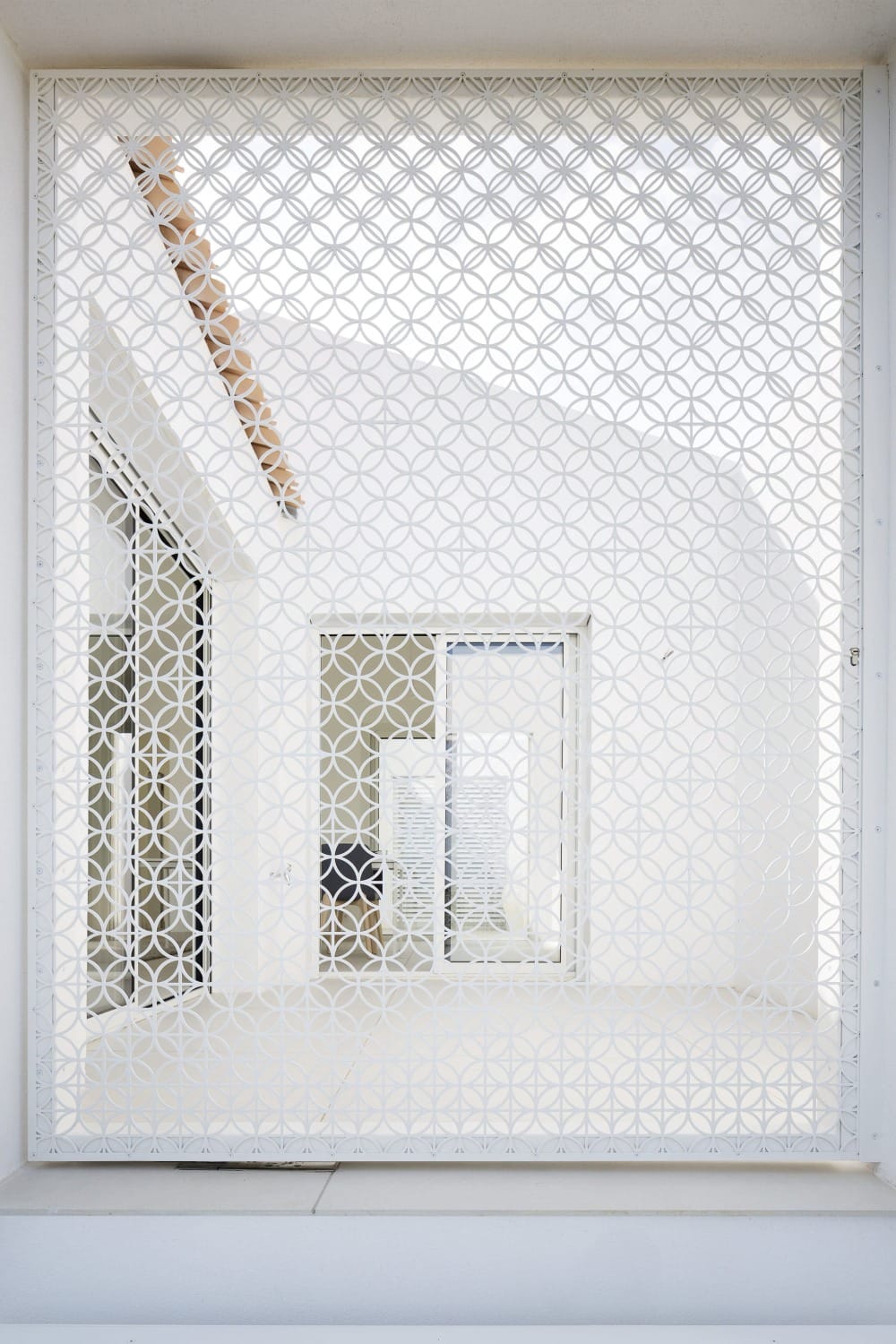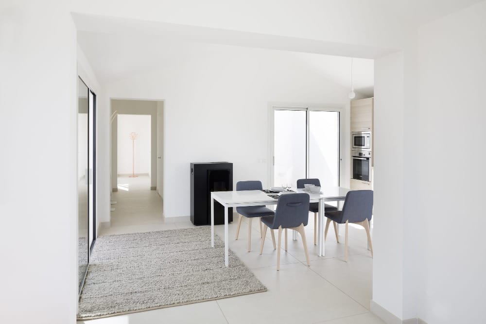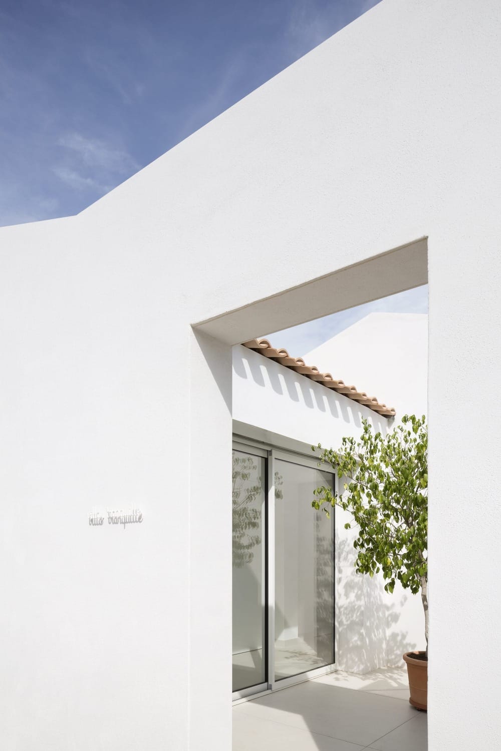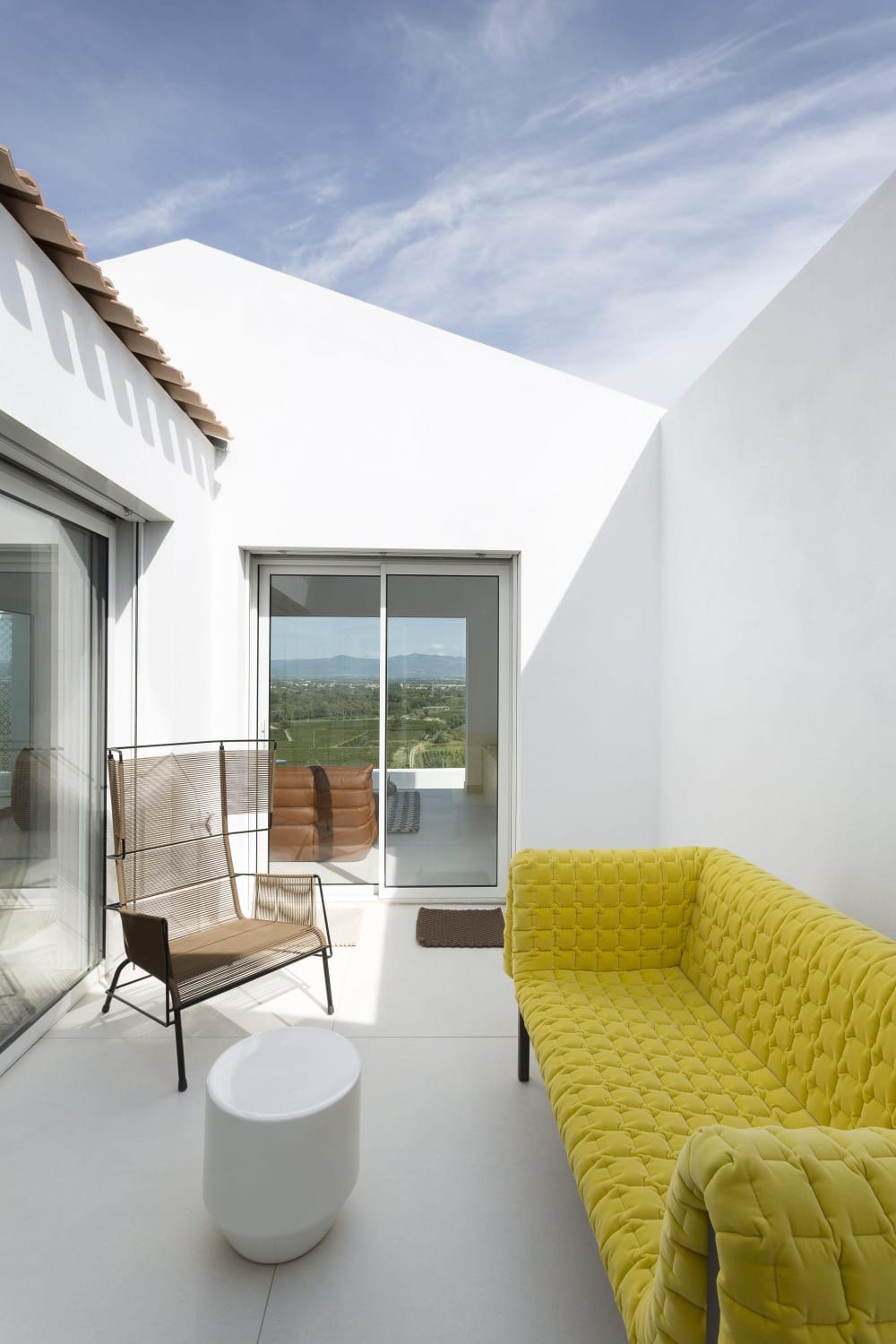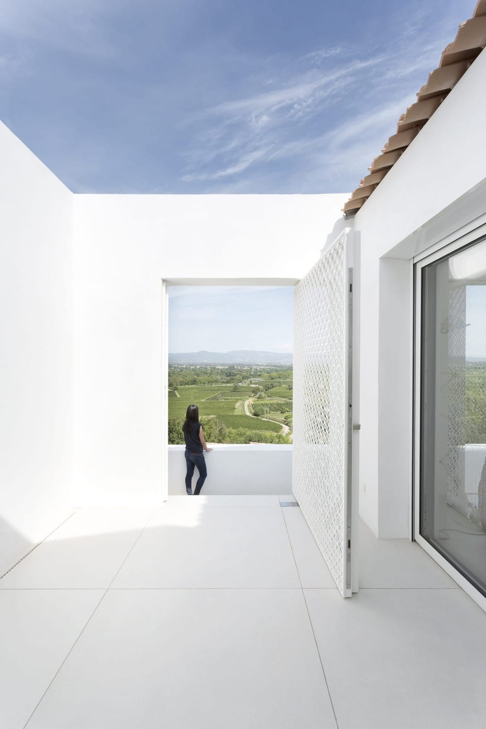 L’architecture combine des matériaux vernaculaires – enduit blanc, tuiles, maçonnerie – avec une écriture contemporaine affirmée par l’absence d’ouvertures latérales et l’emploi de grilles en acier thermolaqué. Un grand châssis fixe cadre la vue vers la vallée, tandis que les patios assurent ventilation naturelle et continuité visuelle. Ce système cloisonné mais traversant redéfinit la relation entre intimité, lumière et paysage, offrant un mode d’habiter méditerranéen tout en sobriété et clarté constructive.