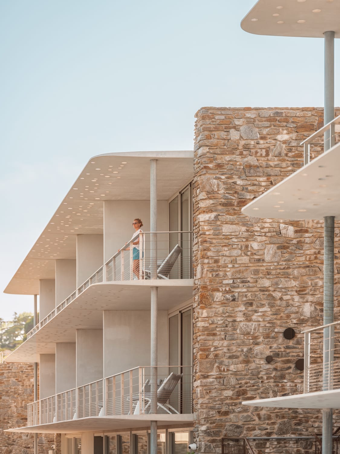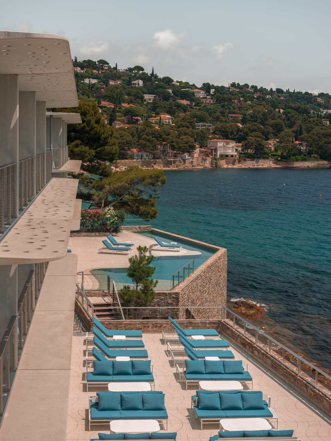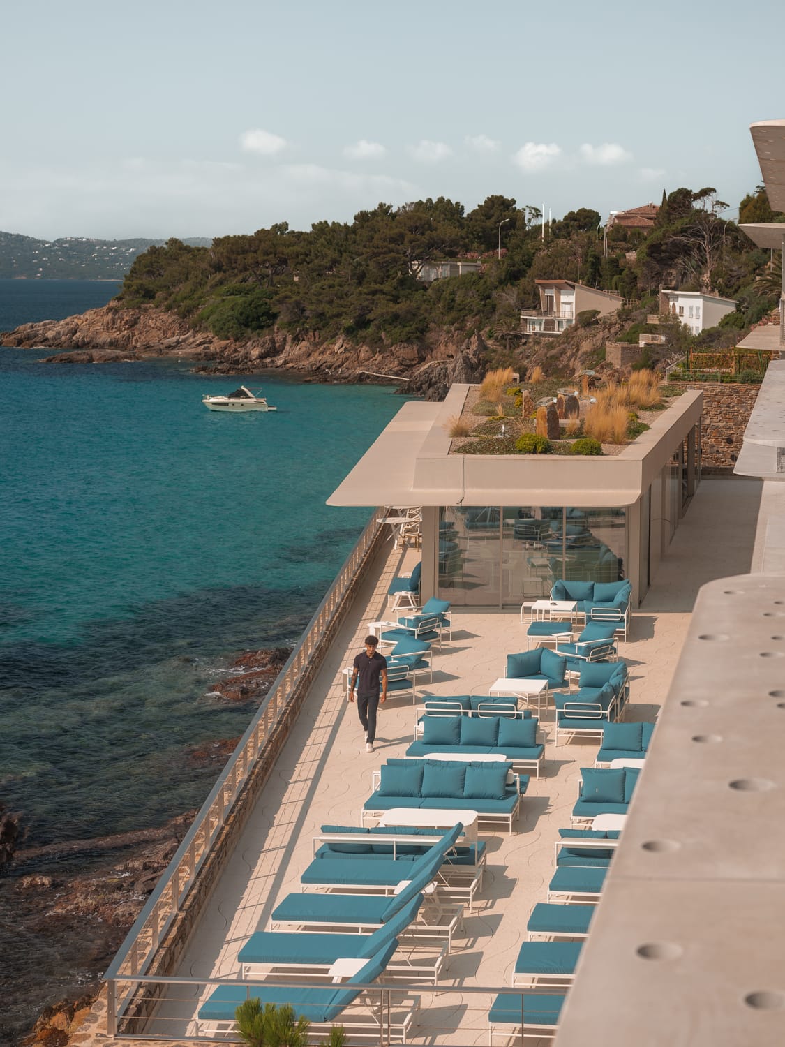 Les choix constructifs expriment une rigueur technique au service du lieu : murs épais, casquettes en BFUP perforé pour maîtriser l’ensoleillement, végétalisation extensive, ouvertures sculptées. Le béton devient ici un matériau de finesse, associé à une mise en œuvre qui favorise l’intégration paysagère. L’Hôtel Les Roches, tel que reconstruit, ne cherche pas à dominer son environnement mais à le révéler. Une démarche contextuelle exigeante, qui redéfinit l’hospitalité en bord de Méditerranée.