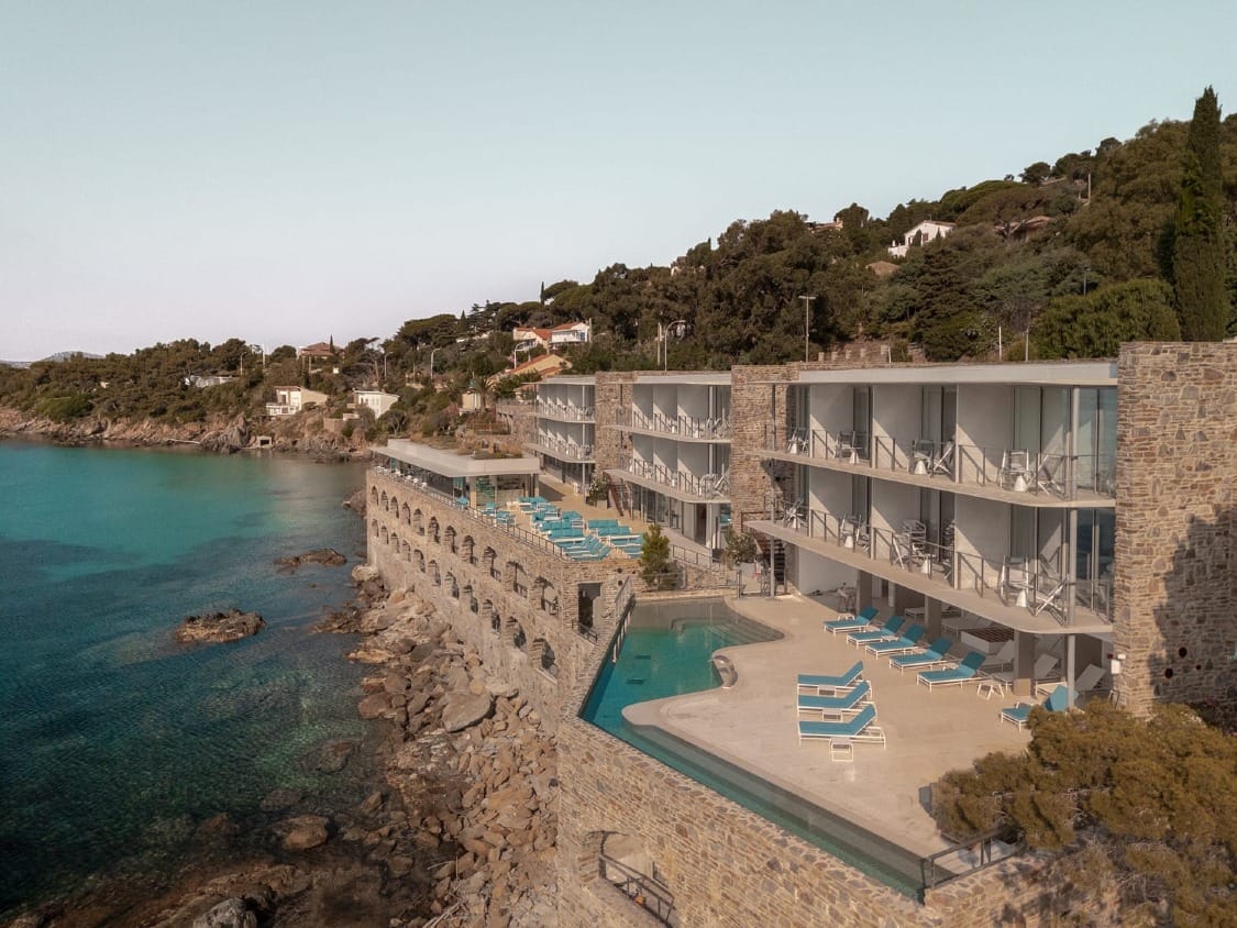 Surplombant la mer depuis les calanques de Peire Gouerbe, l’Hôtel Les Roches signe un retour maîtrisé à la villégiature méditerranéenne. PietriArchitectes orchestre ici une reconstruction complète, fidèle à l’esprit du lieu tout en s’effaçant dans le paysage. Loin de tout effet spectaculaire, le bâtiment s’ancre dans la pente, épouse les lignes du terrain et s’insère dans une composition géologique et végétale, travaillée avec précision. Le choix des matériaux, comme la pierre de Bormes, confère au projet une authenticité sobre et ancrée.