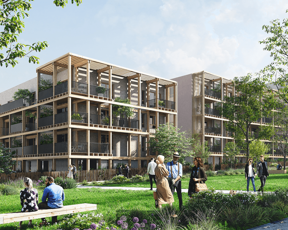 Composé de 81 logements, répartis entre quatre immeubles collectifs et un bâtiment intermédiaire, l’ensemble se distingue par ses façades en double peau de bois et ses balcons végétalisés, participant à l’intégration paysagère et au confort des habitants.
