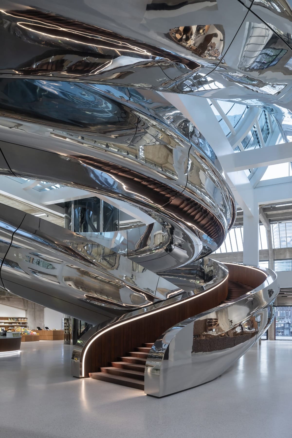 Maîtrise d’ouvrage : Fondation Droom en Daad — Architecte : MAD Architects — Programme : Rénovation d’un musée, 16 000 m² sur deux niveaux dont 10 509 m² accessibles au public (hors escalier tornade), hauteur totale du bâtiment : 30 mètres — Adresse : Rotterdam (Pays-Bas) — Superficie du site : 8 000 m² — Année : 2018–2025 — Crédits photos : Iwan Baan