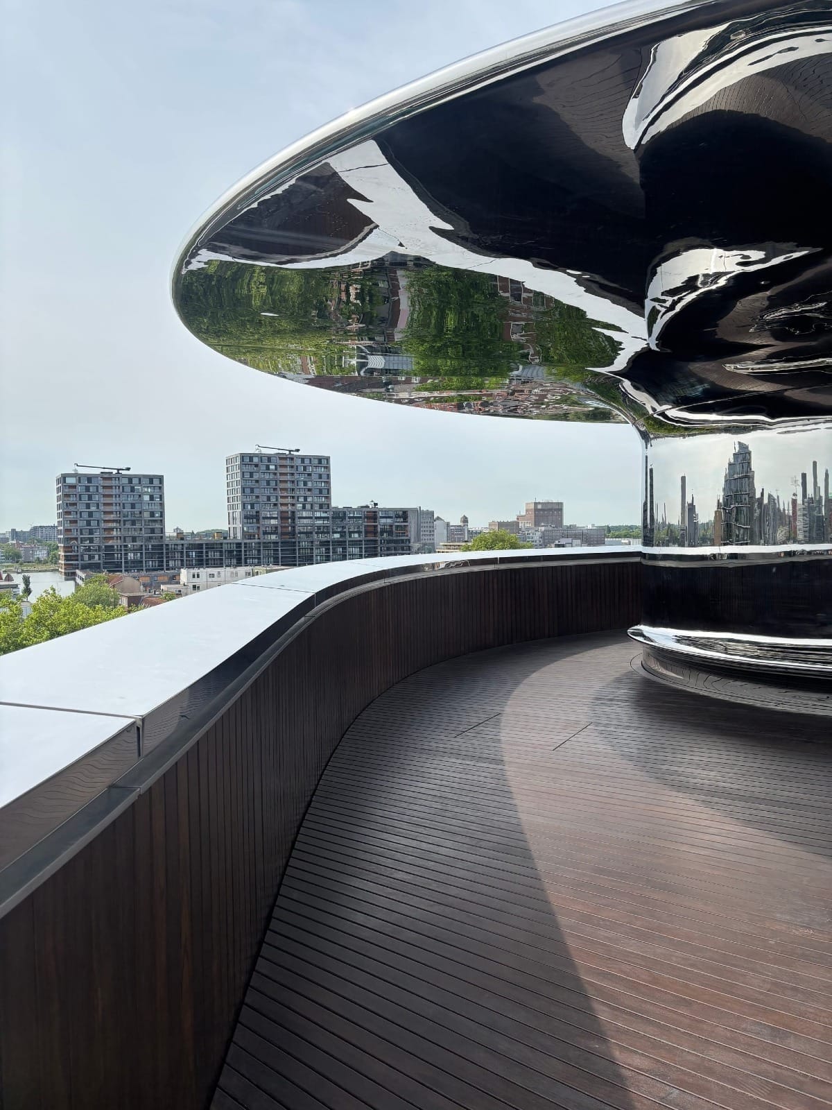 Élément central : un escalier monumental en double hélice qui s’élève au cœur de la Tornade, sculptural, spectaculaire, presque céleste. Il mène à une plateforme d’observation à 24 mètres de haut, comme suspendue au-dessus des docks. À l’extérieur, l’acier réfléchissant absorbe les teintes du ciel ; à l’intérieur, c’est le bois Kebony qui prend le relais, matière vivante, dense et douce, choisie pour ses qualités durables et sa patine naturelle.