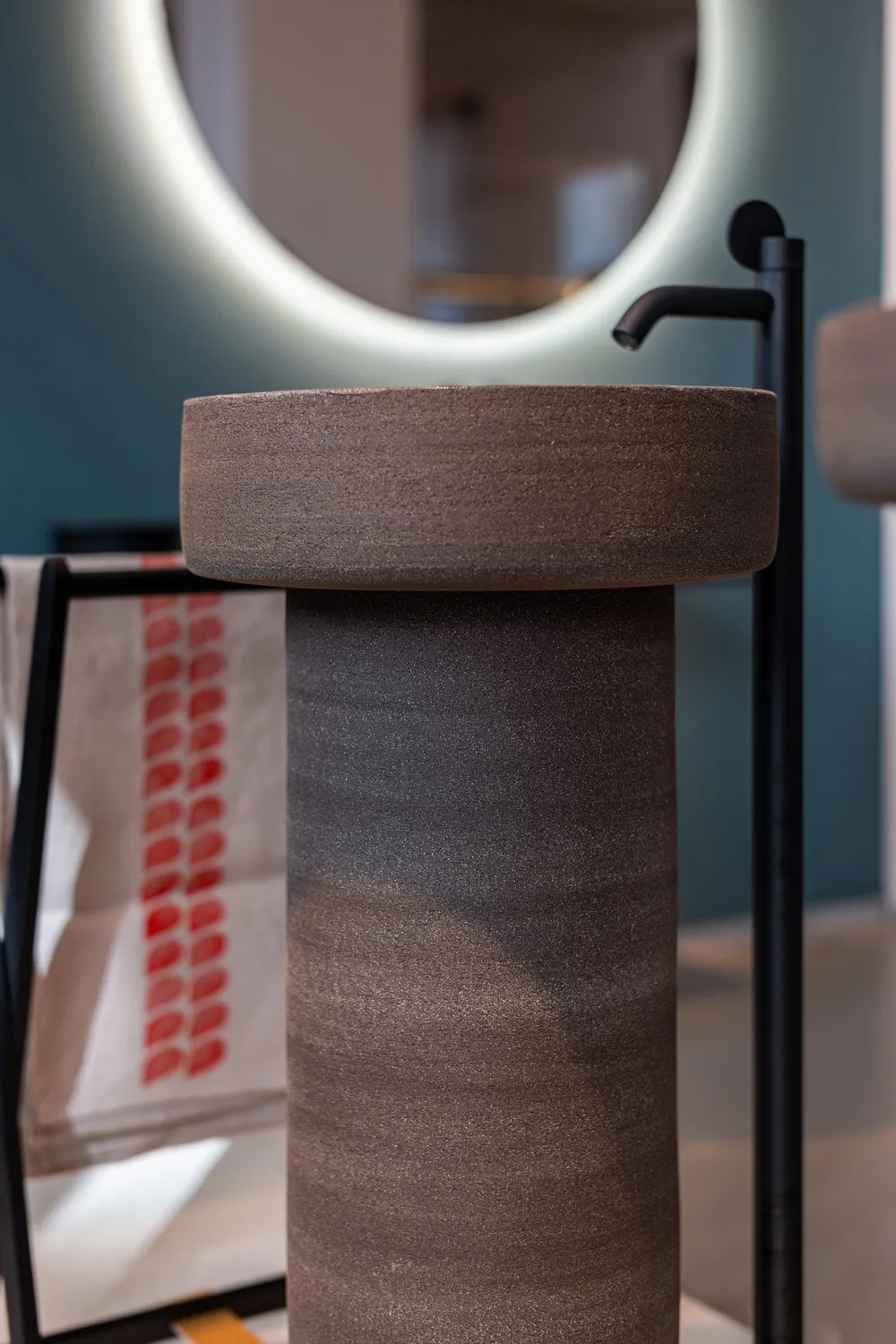 Avec Cenote a Colonna, Patricia Urquiola poursuit pour Agape une recherche centrée sur la matière, le geste artisanal et l’émotion sensorielle. Ce lavabo autoportant, entièrement façonné en argile réfractaire tournée à la main, associe un piédestal sobre à une vasque circulaire aux parois épaisses. La surface extérieure conserve une texture brute, tandis que l’intérieur émaillé, décliné en crème ou bleu profond, crée un contraste subtil et tactile.