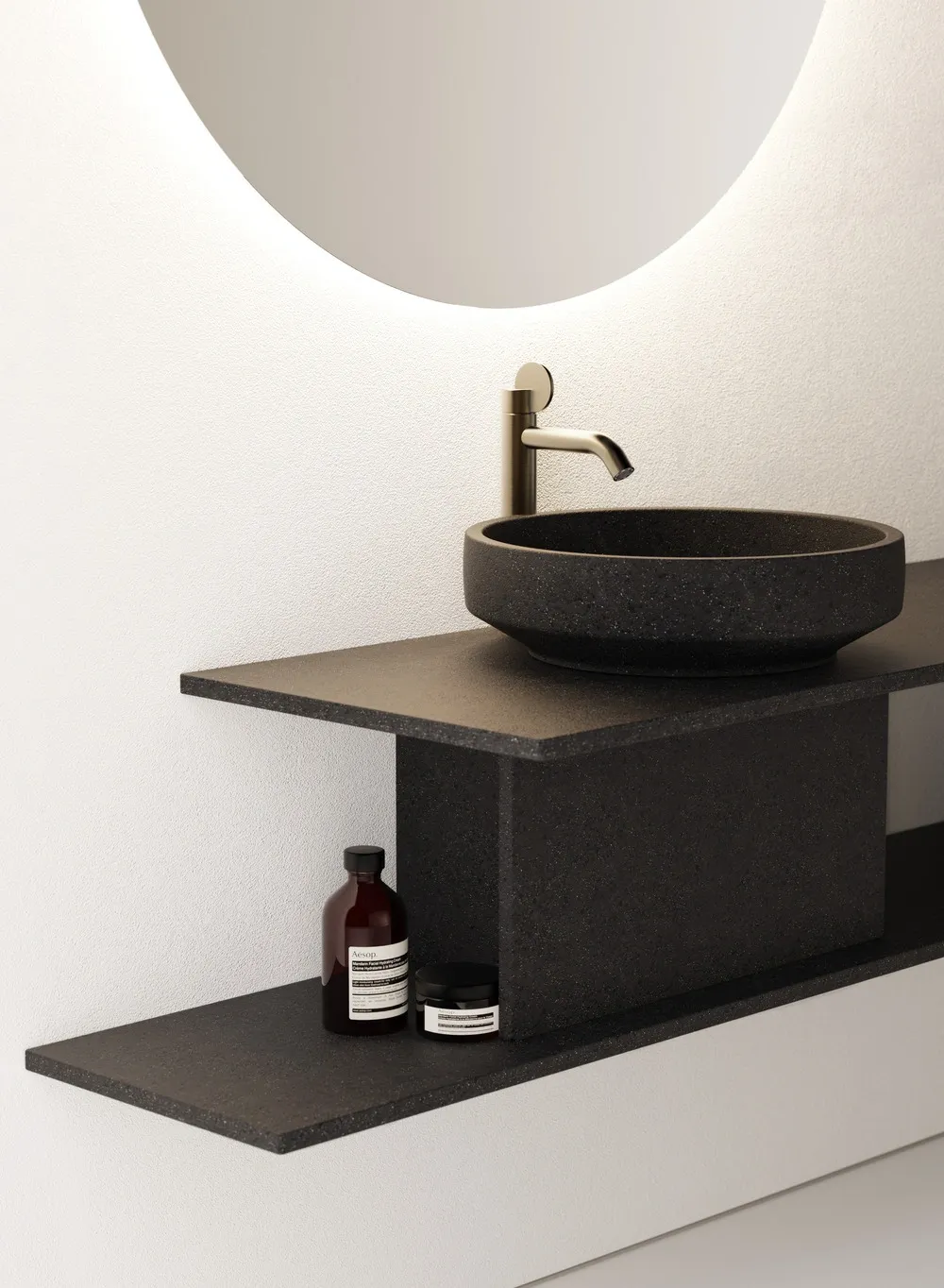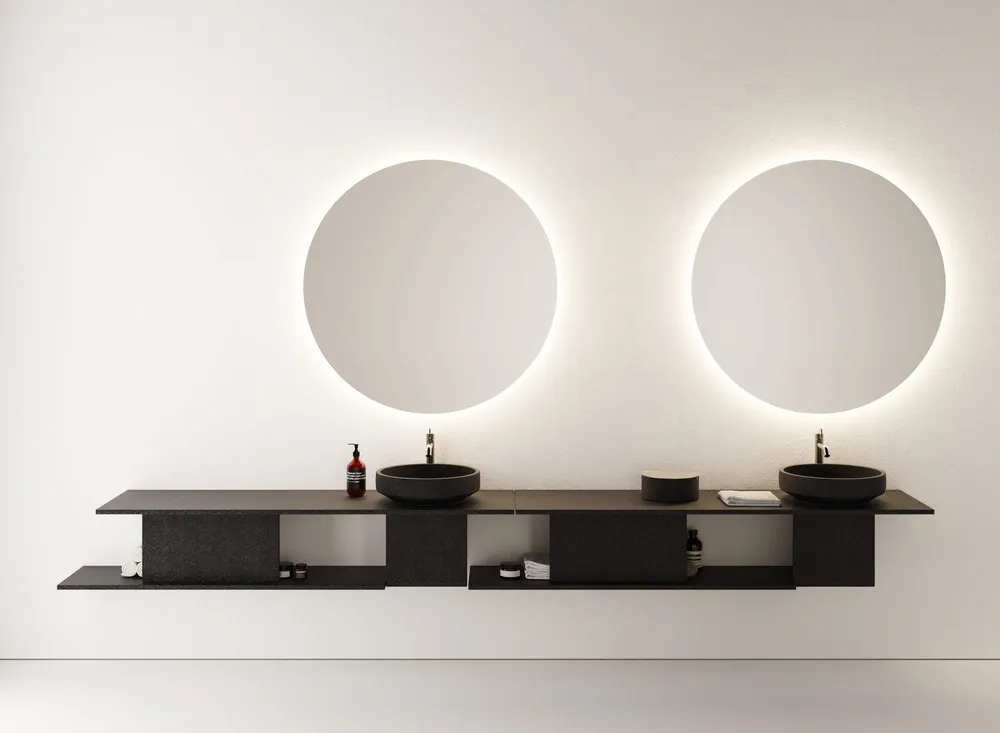 Dans la continuité de cette exploration, le système Bloque joue la carte de la tectonique visuelle. Plans décalés, assemblages perpendiculaires et matériaux à fort potentiel tactile (bois, pierre de lave…) définissent un langage formel adaptable, modulaire et sobre. Pensé pour accueillir les lavabos autoportants, ce meuble aux lignes minimalistes offre une liberté d’agencement totale, en résidentiel comme en espace public.