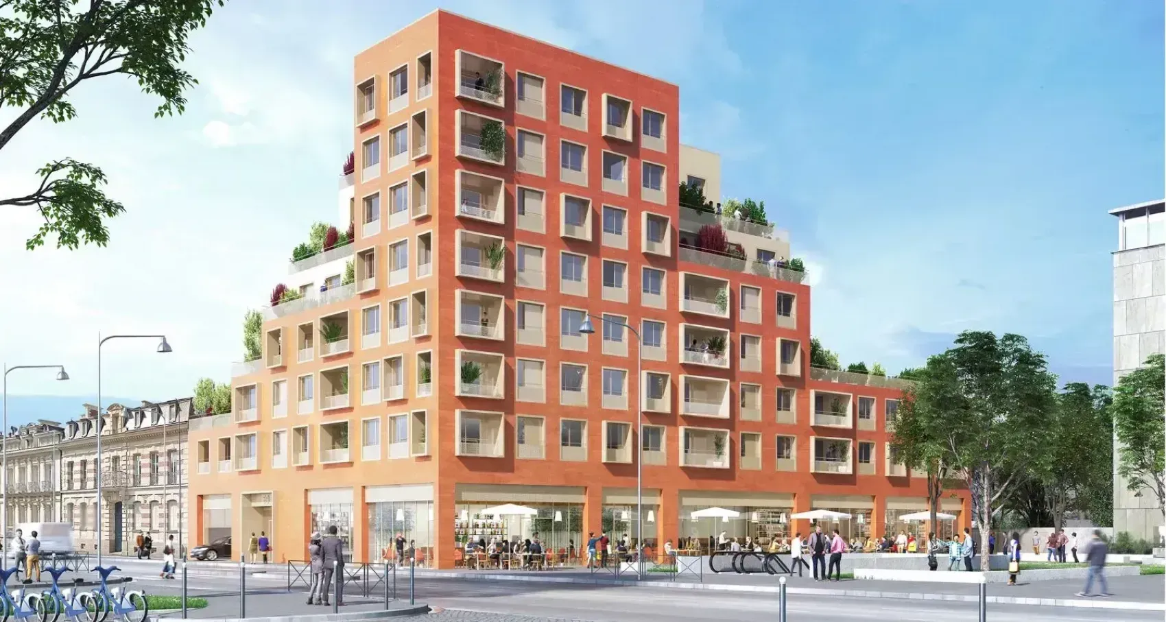 Ce programme met en avant la mobilité durable grâce à sa connexion directe avec les transports en commun et son rez-de-chaussée actif qui dynamise la vie locale. Certifié NF Habitat HQE et conforme à la RT 2012 -20%, il s’inscrit dans une démarche durable, conjuguant efficacité énergétique et engagement social. L’ensemble illustre ainsi la capacité de l’architecture à structurer un cadre de vie fonctionnel, accessible et intégré à son environnement urbain.