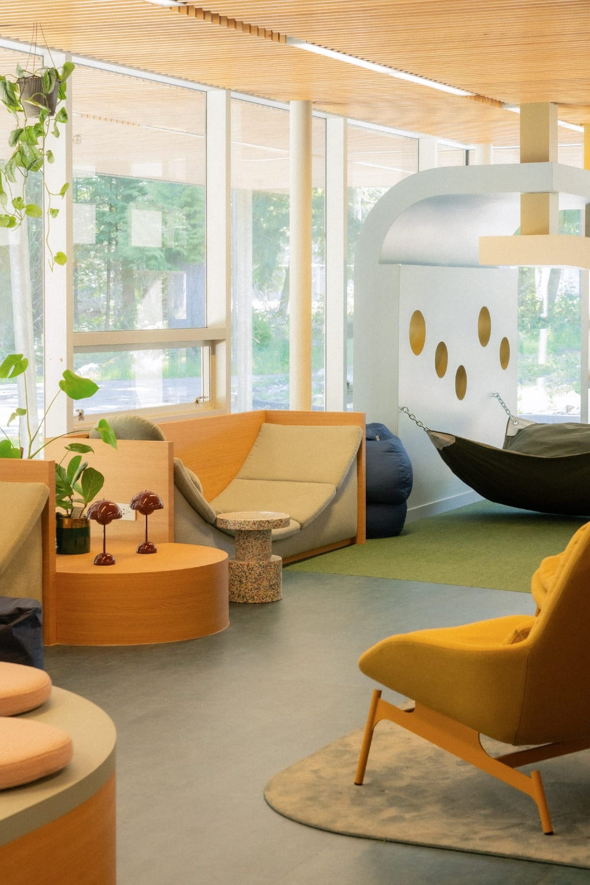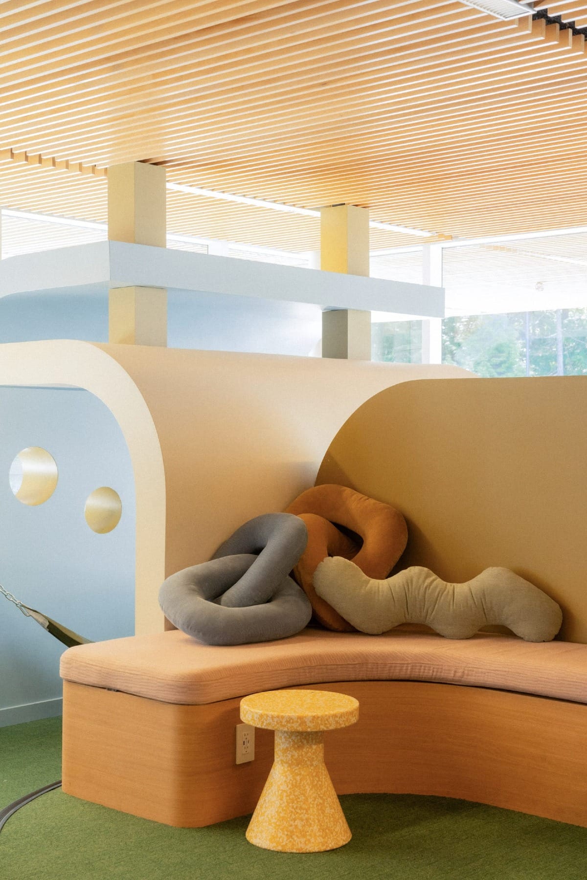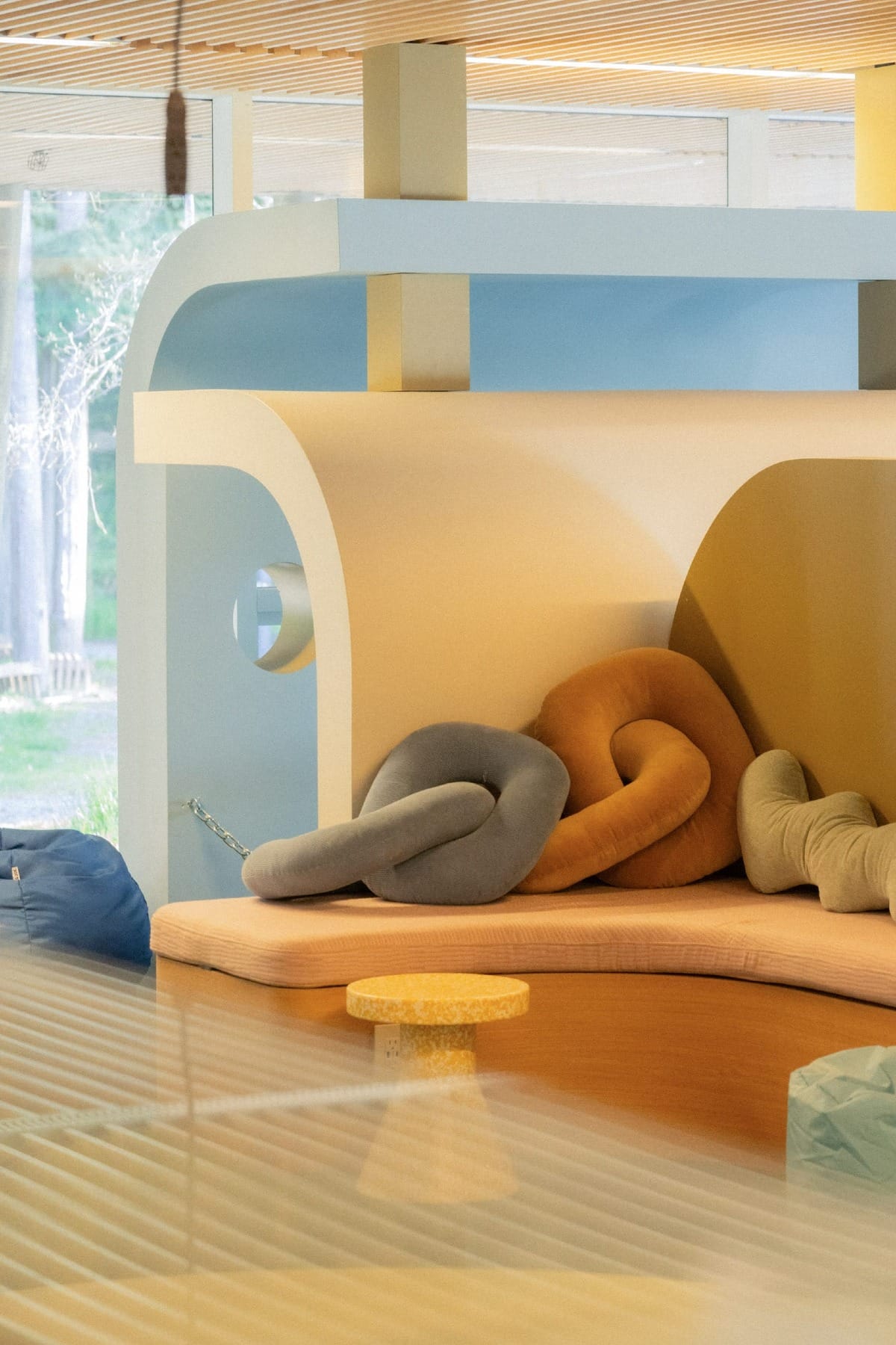 L’aménagement repose sur une variété de configurations : alcôves feutrées en moquette bleue, mobilier sinueux, assises modulables, niches ludiques pour enfants et tables en terrazzo. Un hamac suspendu dans une arche centrale agit comme signal spatial et zone de repos. L'ensemble privilégie les lignes courbes et les formes enveloppantes, favorisant la concentration comme la détente dans une ambiance multisensorielle.