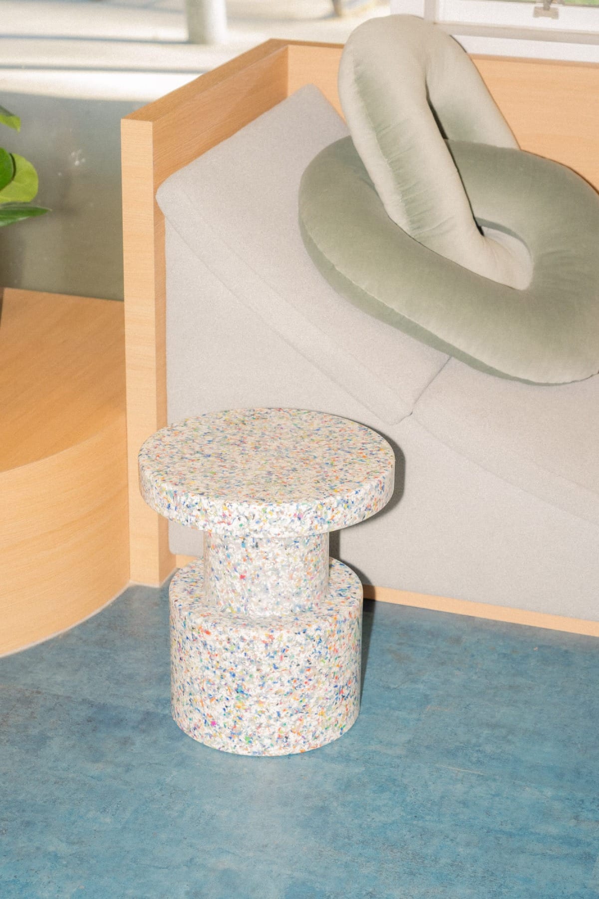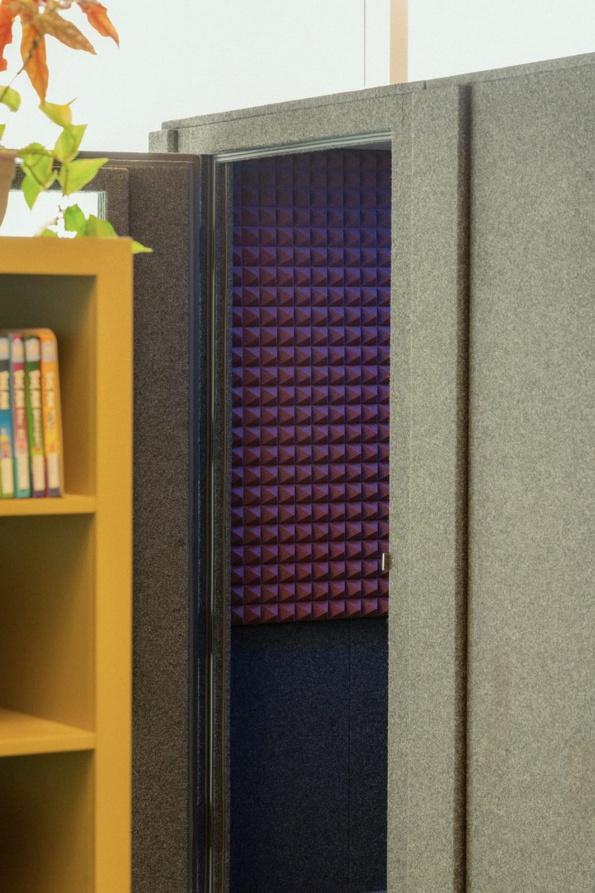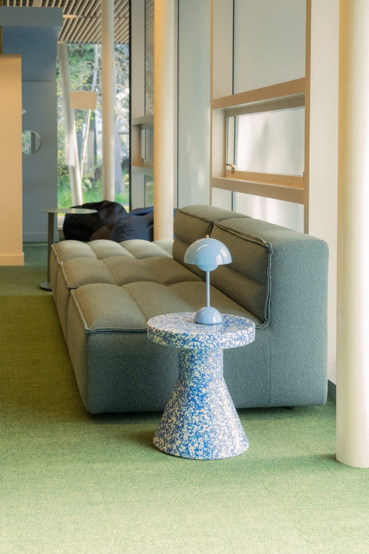 L’aménagement repose sur une variété de configurations : alcôves feutrées en moquette bleue, mobilier sinueux, assises modulables, niches ludiques pour enfants et tables en terrazzo. Un hamac suspendu dans une arche centrale agit comme signal spatial et zone de repos. L'ensemble privilégie les lignes courbes et les formes enveloppantes, favorisant la concentration comme la détente dans une ambiance multisensorielle.