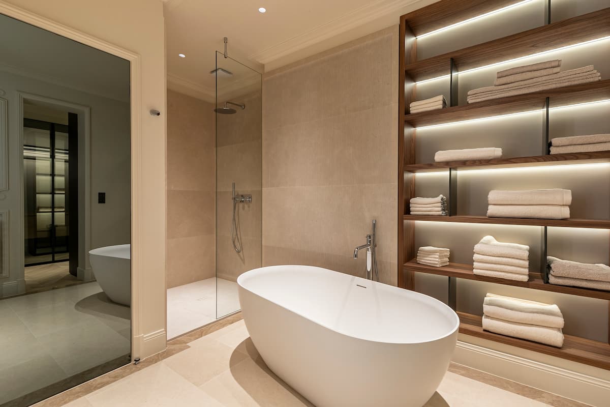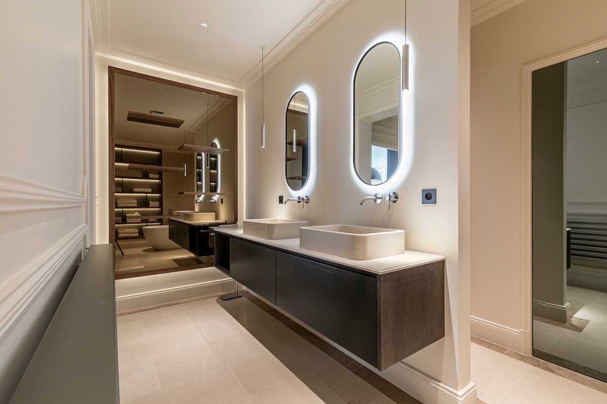 La salle de bain s’impose comme un lieu de détente, où matières minérales et éclairage subtil créent une ambiance chaleureuse et apaisante. L’ensemble reflète une approche où confort, élégance et intemporalité s’unissent, offrant aux occupants un cadre de vie haut de gamme et parfaitement adapté aux usages contemporains.