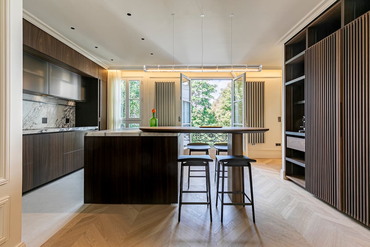 Les volumes généreux sont sublimés par des menuiseries sur mesure et un agencement fluide, où boiseries classiques et mobilier aux lignes épurées se répondent. Le séjour, lumineux et convivial, s’articule autour d’un aménagement central favorisant la circulation et l’échange.