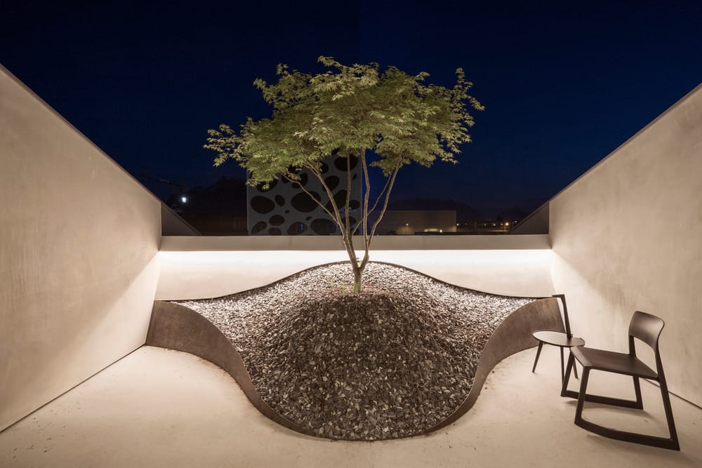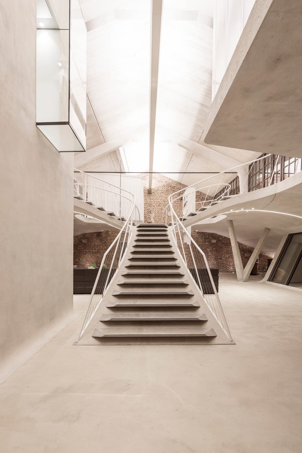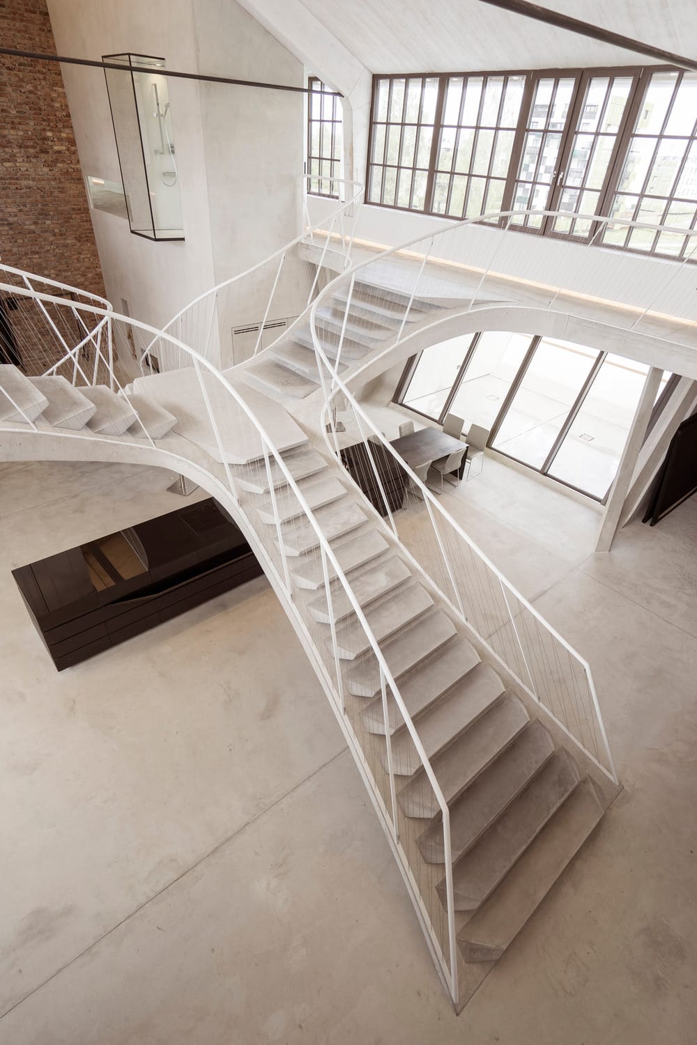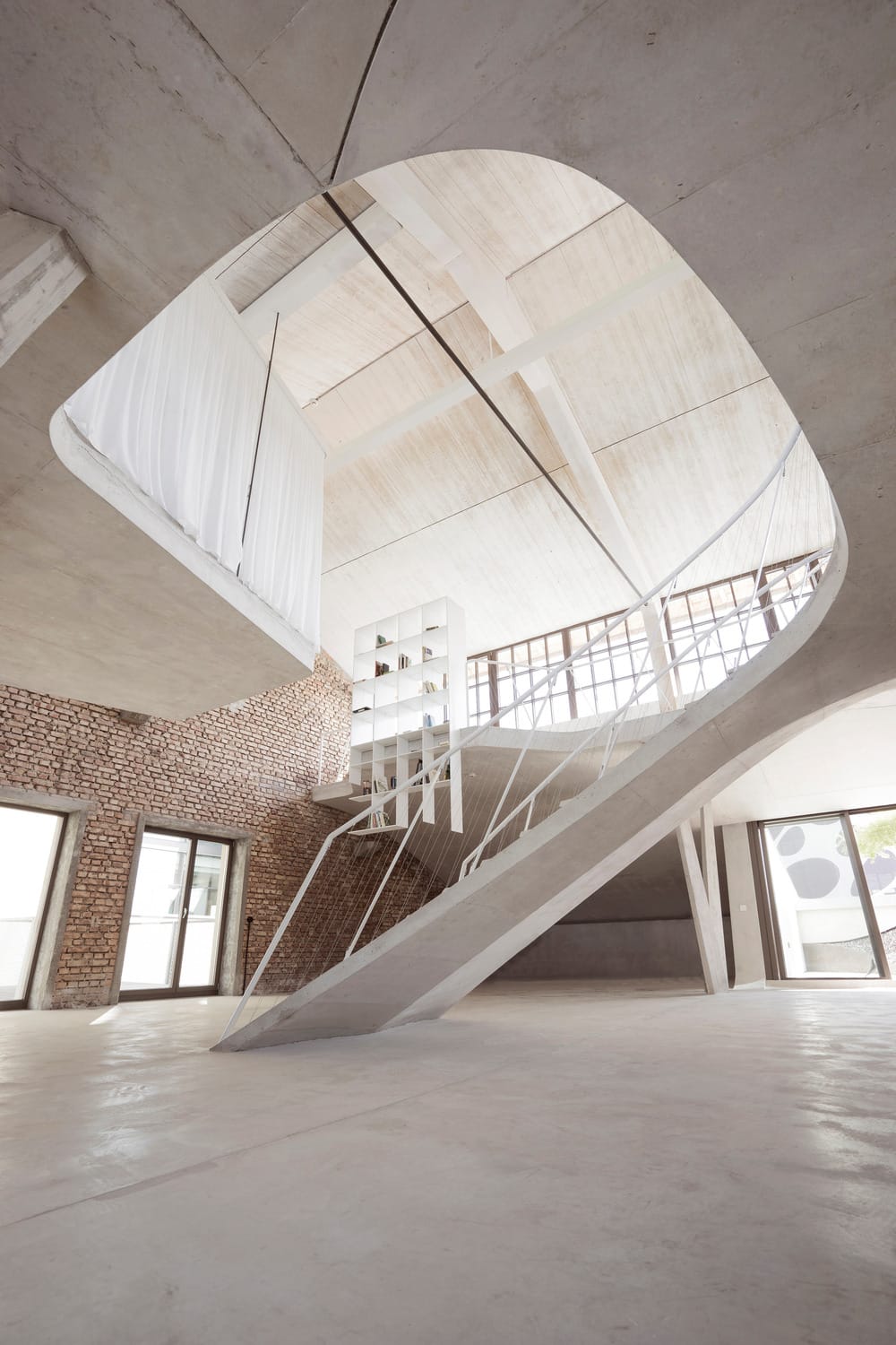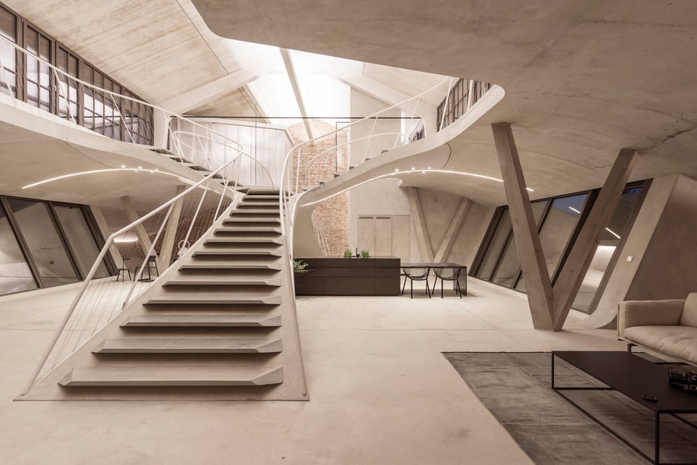Au centre de la composition s’élève une spectaculaire sculpture-escalier, pièce maîtresse à la fois fonctionnelle et symbolique. D’une seule coulée de béton, elle articule les circulations, crée des volumes et génère des lignes de fuite continues. Elle délimite des zones sans jamais les cloisonner : la cuisine linéaire de sept mètres trouve refuge sous sa voûte, tandis qu’au niveau supérieur, les plateformes suspendues accueillent lit, bain ou bibliothèque dans une architecture fluide. Les éléments techniques et les corps de bâtiment (chambre, salle d’eau, chambre d’amis) s’organisent comme des satellites autour de cette ossature centrale, entre sol bétonné et briques laissées brutes.