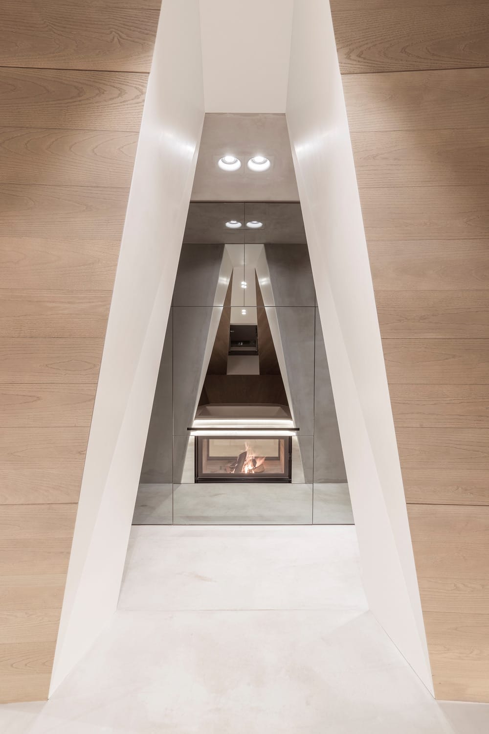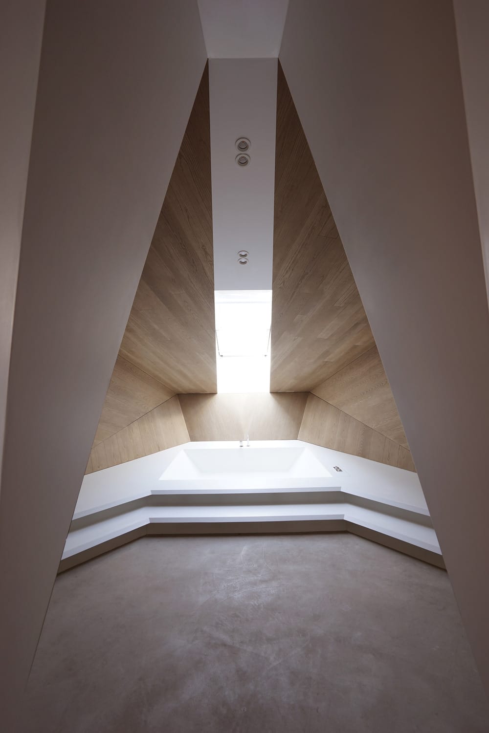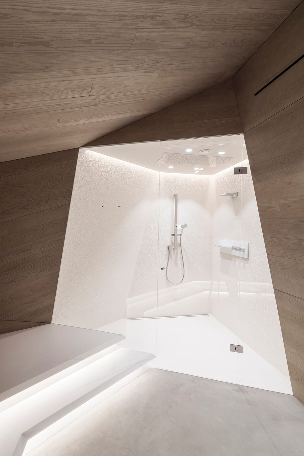 Le traitement des matériaux renforce l’homogénéité de l’ensemble. Béton ciré, vitrage, acier ou rideaux filtrants participent d’un même langage, sobre et maîtrisé. Les meubles semblent issus de la structure elle-même : étagères suspendues, plans en saillie ou volumes insérés, à l’image de la bibliothèque qui traverse les niveaux. La douche en verre, haute de cinq mètres, illustre l’ambition spatiale du projet : faire dialoguer légèreté et monumentalité, jusqu’à l’espace bien-être, dissimulé dans les replis de la composition.
