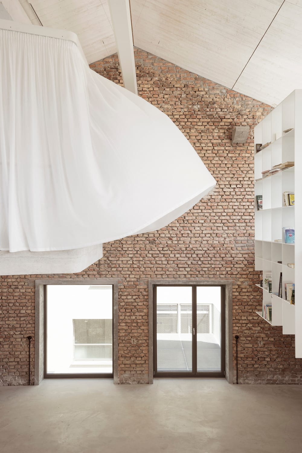 Dans l’ancien hall de la caserne Panzerhalle à Salzbourg, l’agence smartvoll signe un projet d’intérieur radical qui redéfinit la notion même de loft. Lauréate d’un concours international en 2013, l’agence livre ici un manifeste spatial en béton poli et maçonnerie apparente, conjuguant virtuosité formelle et lisibilité structurelle sur deux niveaux de 350 m². L’espace d’origine, avec ses huit mètres de hauteur libre et sa charpente apparente, est magnifié plutôt que fragmenté. La lumière naturelle entre généreusement grâce à une bande vitrée continue en partie haute, libérée de toute galerie ou cloisonnement.