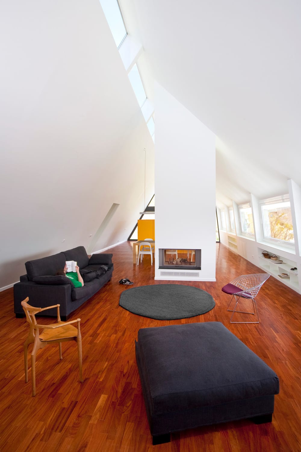 ※L’intérieur s’organise autour de cette section singulière, entre voûte inversée et panorama cadré. Un grand percement en façade sud éclaire les pièces en sous-sol et introduit un deuxième salon largement ouvert. Le projet propose ainsi une lecture contemporaine de l’habiter, dans le respect de l’empreinte constructive existante, tout en affirmant une spatialité nouvelle.