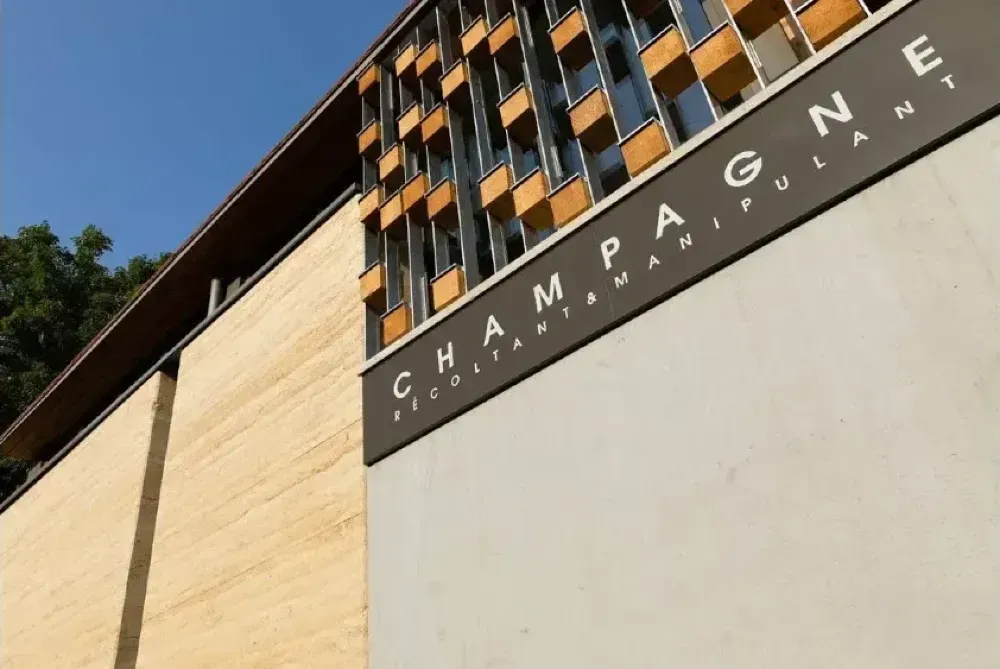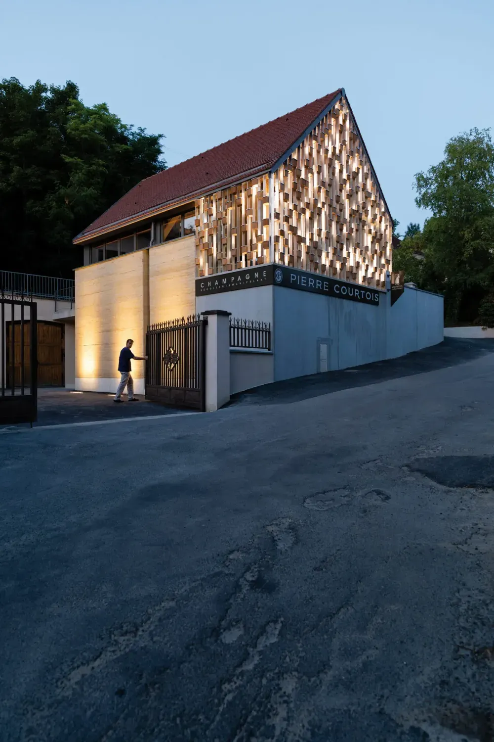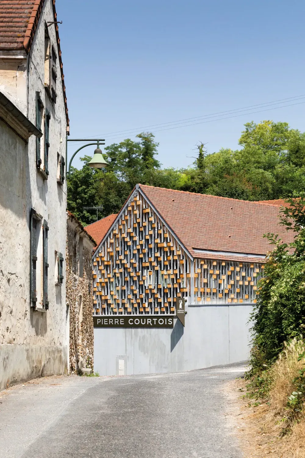 Dans un village classé de la vallée champenoise, la maison de champagne conçue par Thierry Bonne Architecte dialogue avec retenue avec la morphologie locale. En façade de rue, le bâtiment prolonge les alignements anciens tout en affirmant une écriture contemporaine sobre, sans pastiche ni rupture. Le projet répond à un double enjeu : affirmer l’identité de la maison Courtois et composer avec un contexte patrimonial exigeant.
