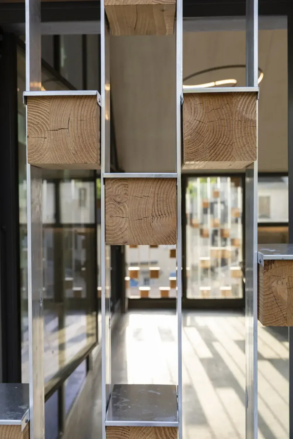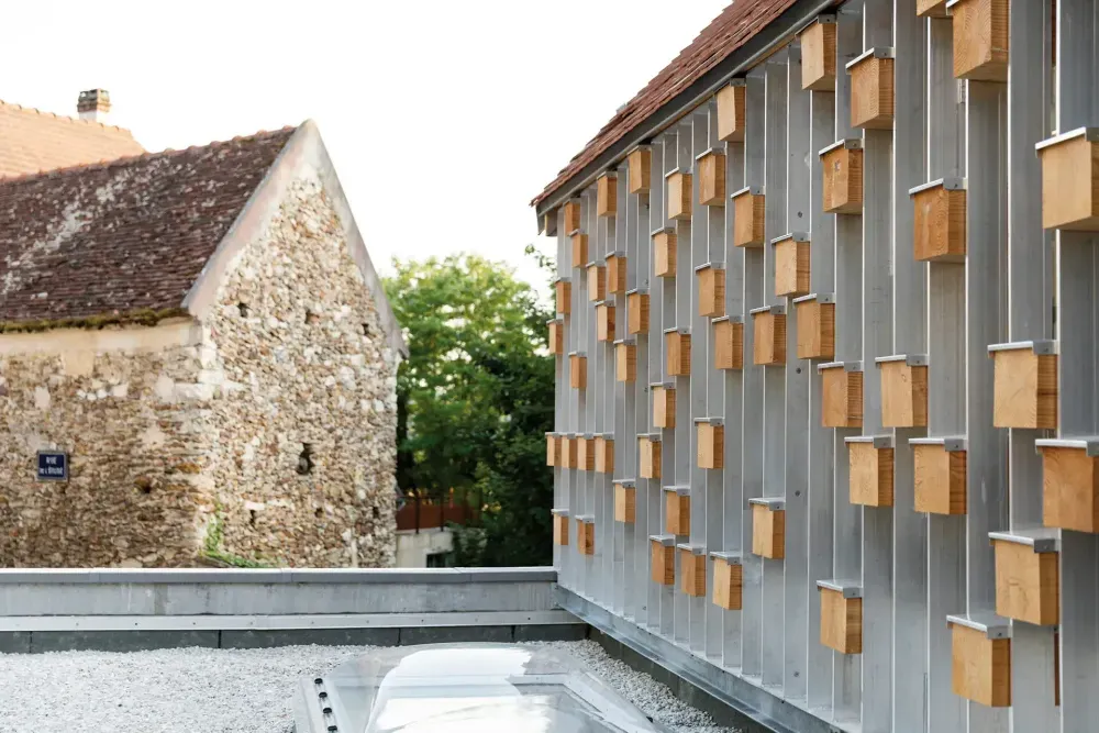 À l’étage, les espaces d’accueil se déploient sous une toiture à deux pans qui évoque les volumes agricoles vernaculaires. Mais la façade sur rue introduit une lecture plus abstraite : une structure en bois clair compose un filtre habité de volumes en saillie, dont les profondeurs variées génèrent un jeu d’ombres mouvantes. Cette double peau protège du soleil tout en préservant l’intimité intérieure.