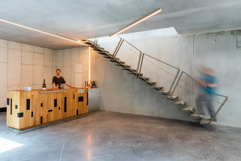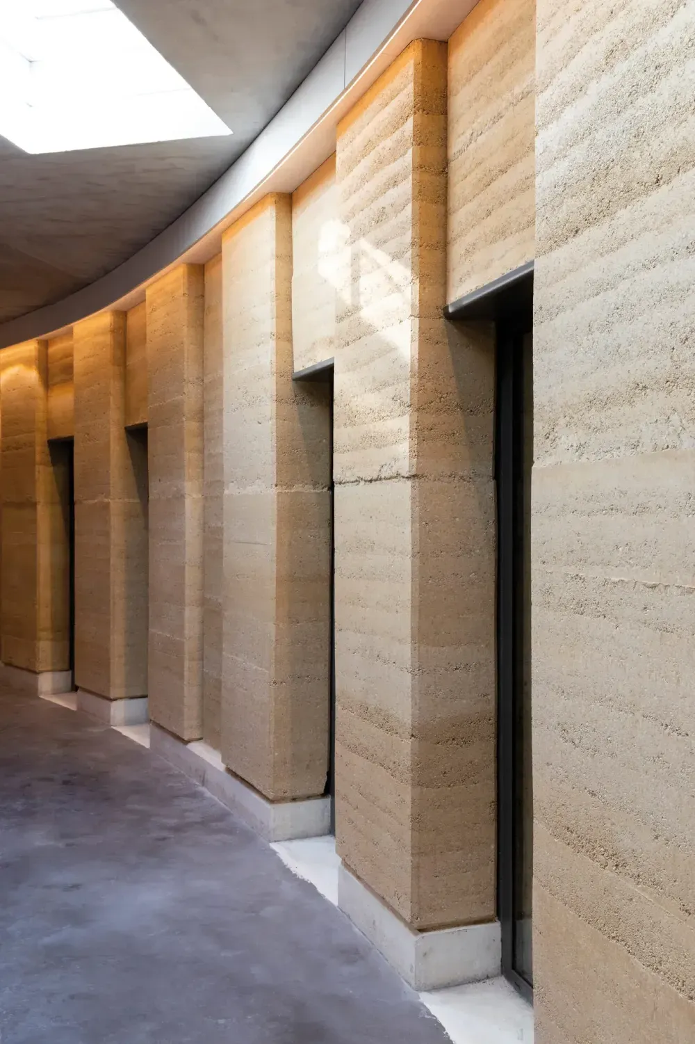 Le rez-de-chaussée, partiellement encastré dans le terrain naturel, abrite les caves de vinification. Il est réalisé en béton brut et en pisé de terre crue, matériau issu du sol viticole, dont la teinte et la texture ancrent le projet dans son terroir. Cette matière, à la fois expressive et performante, assure une régulation passive de l’hygrométrie et de la température, essentielle à la conservation du vin.