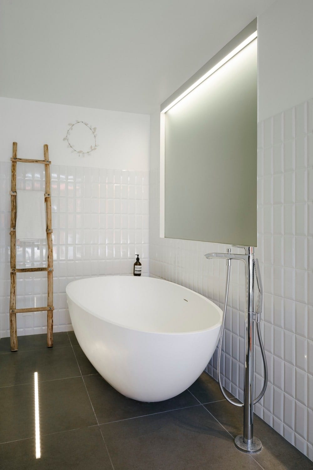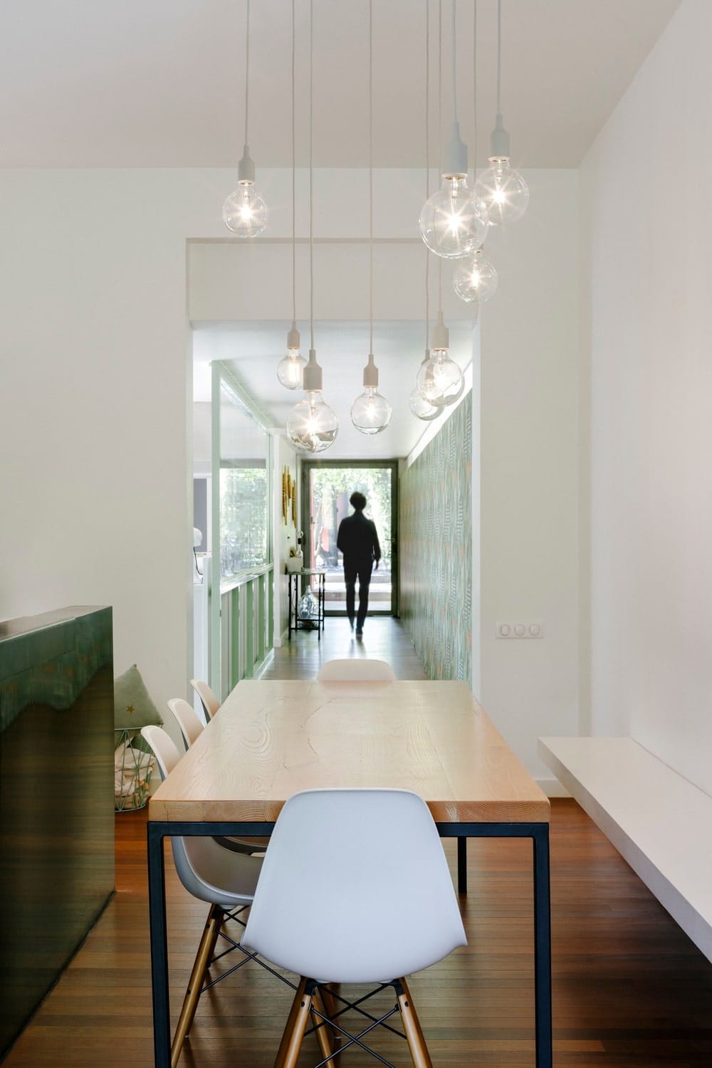 Des dispositifs de transparence ponctuelle – cloisons vitrées, ouvertures traversantes – viennent rythmer la circulation et introduire des séquences lumineuses variées. Les pièces humides sont réorganisées autour d’un vitrage translucide central, maximisant la diffusion naturelle.