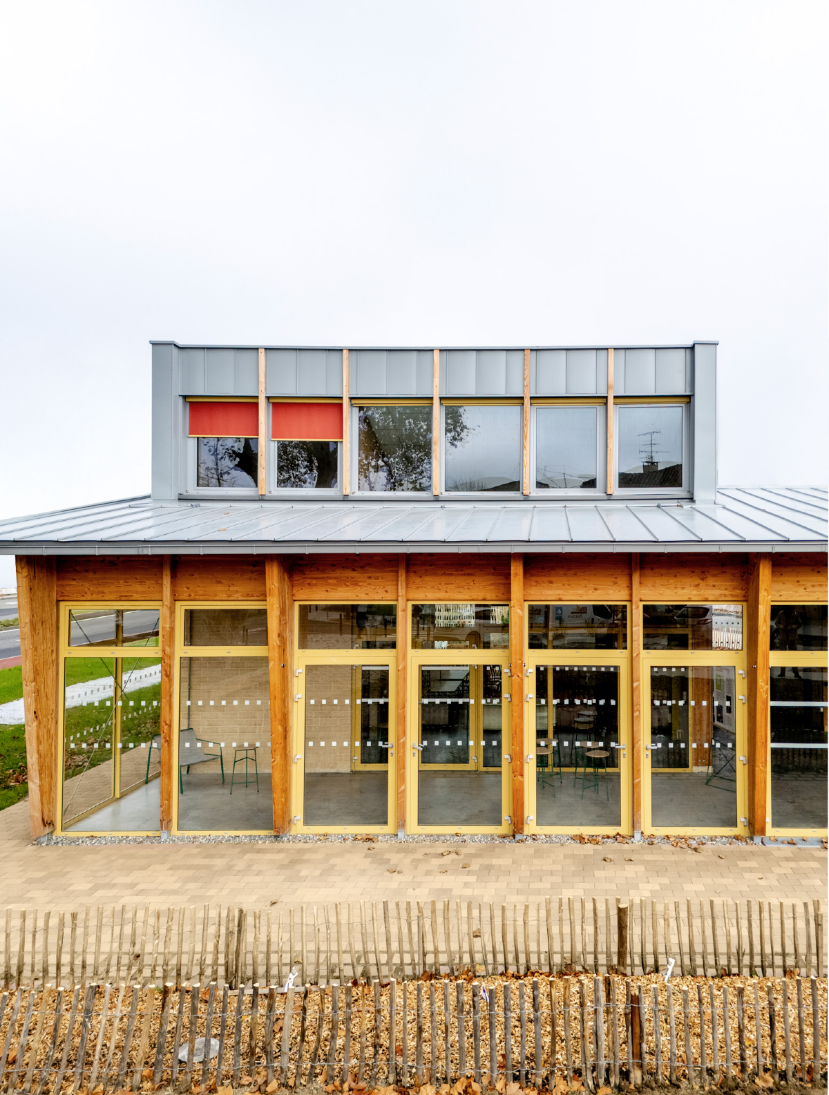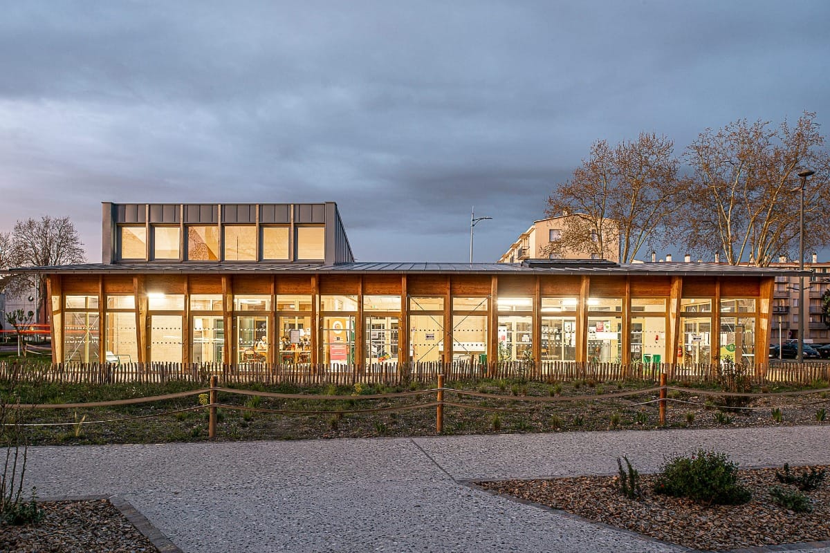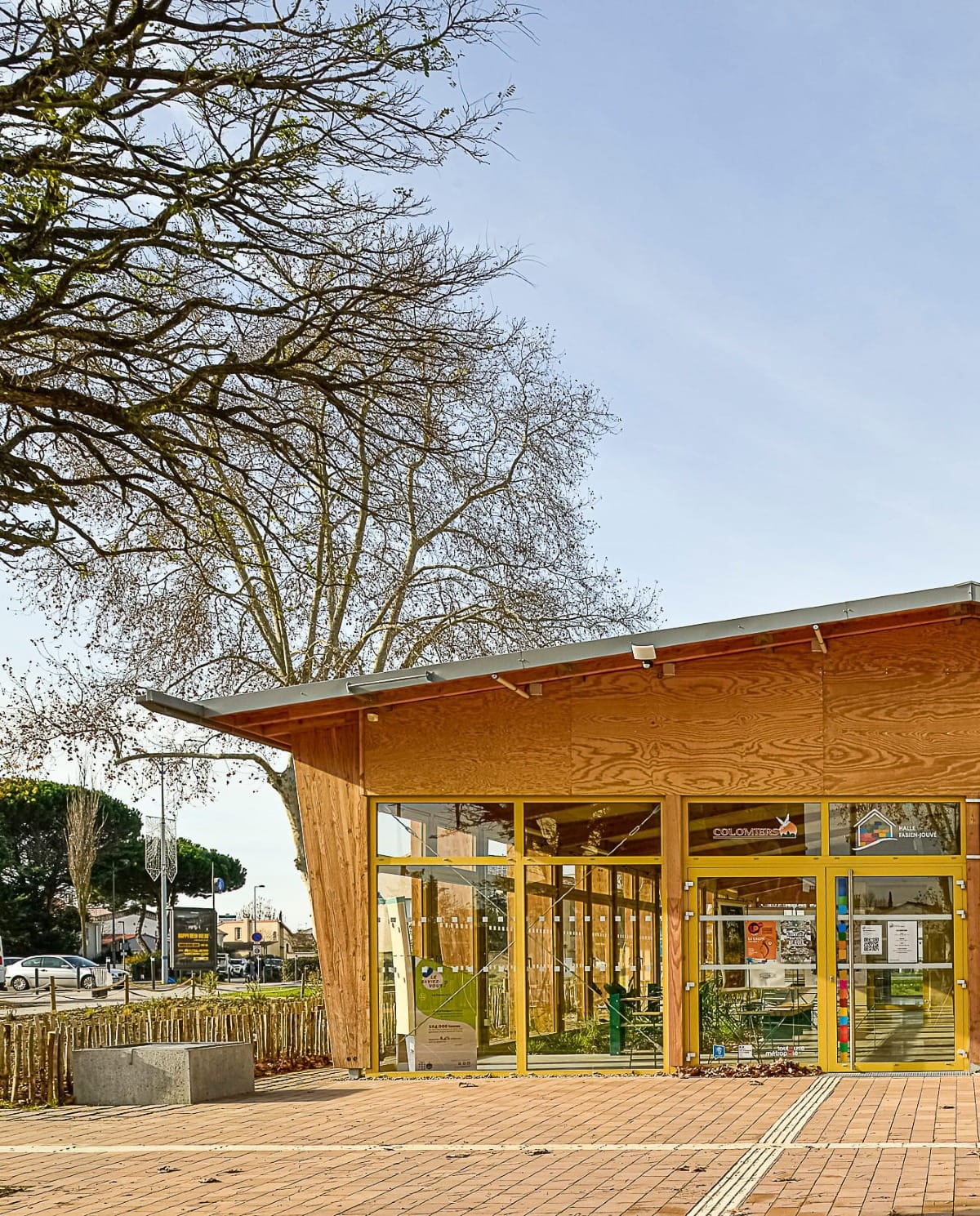 Maîtrise d’ouvrage : Ville de Colomiers — Architecte : C+2B Architecture — Surface : 400 m² — Adresse : Colomiers (31) — Co-traitants : Edeis, Ecozimut, Sigma Acoustique, Les Économistes Associés, Saut de Loup — Type de marché : Concours négocié — Coût des travaux : 1 057 557 € HT — Coût/m² (hors VRD) : 2 497,3 € — Démarche environnementale : Bâtiment Durable Occitanie (BDO) – niveau OR (conception et réalisation) — Crédits photos : Sylvain Mille