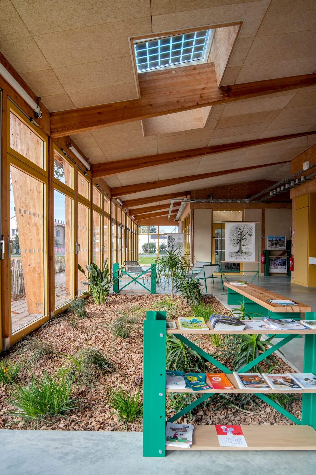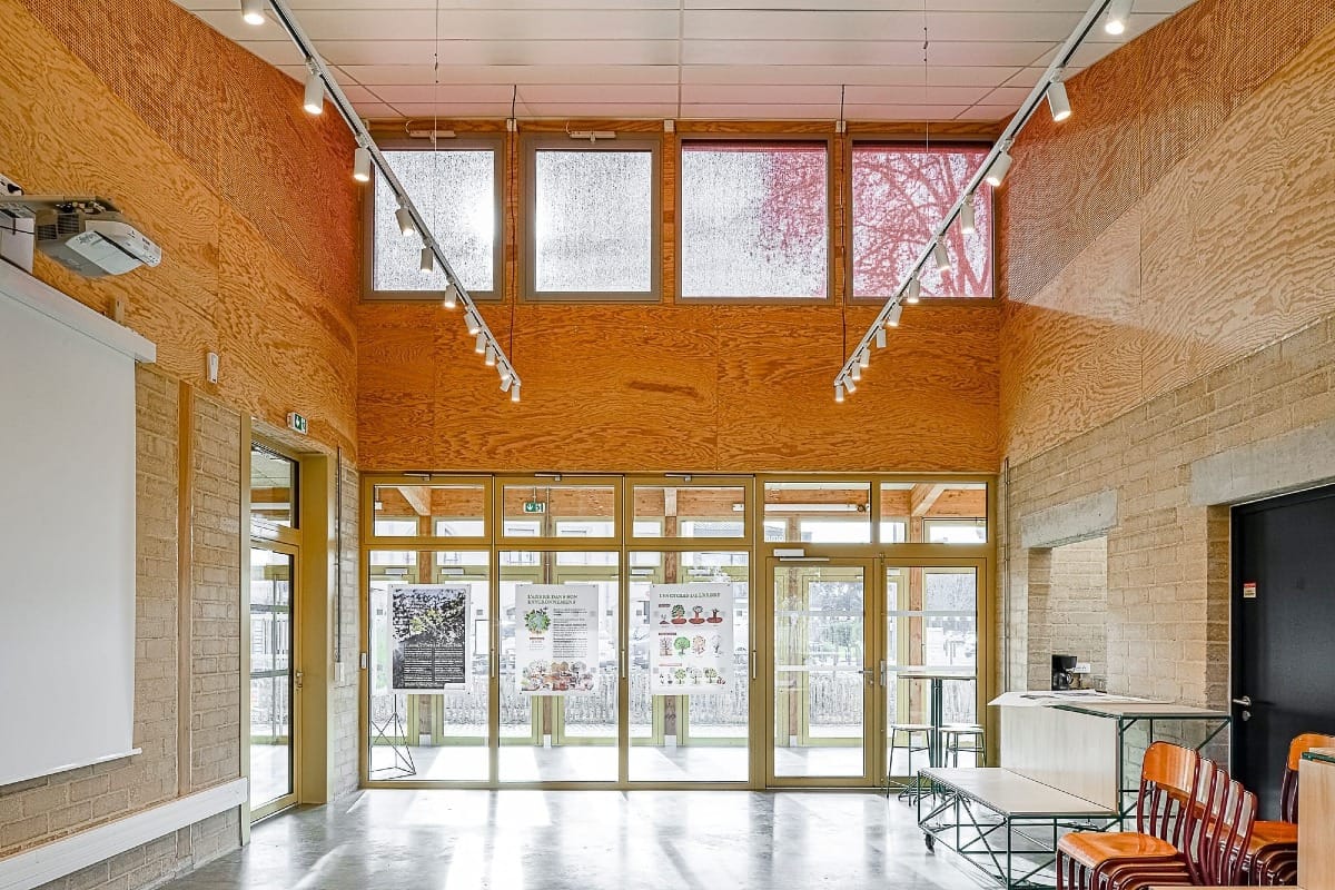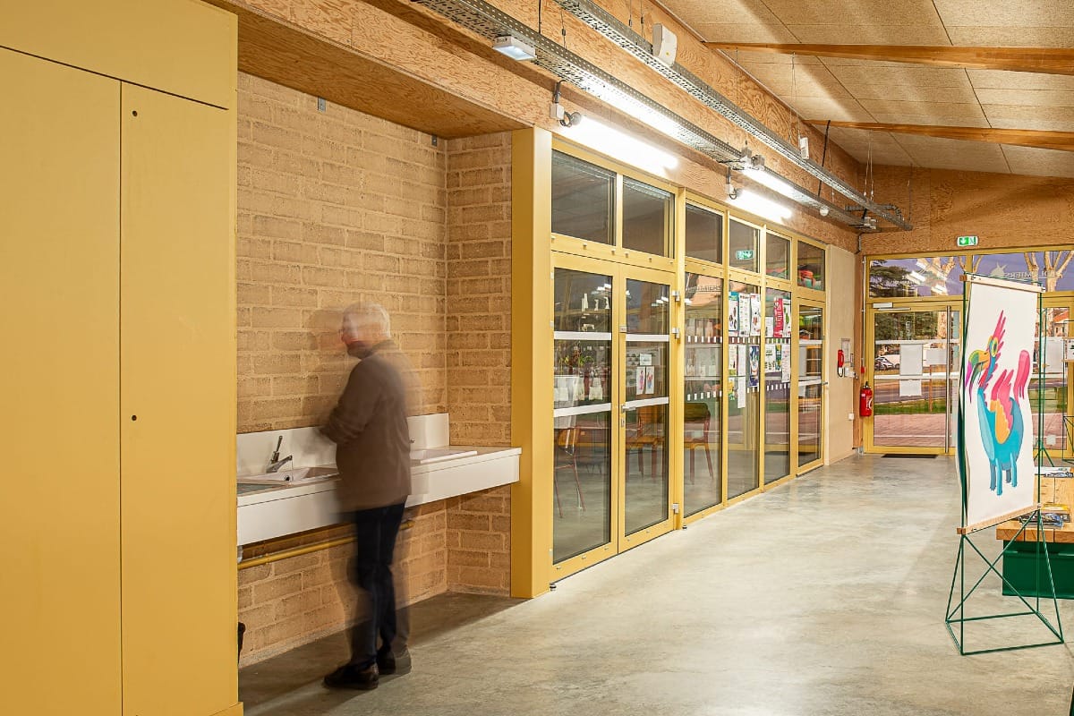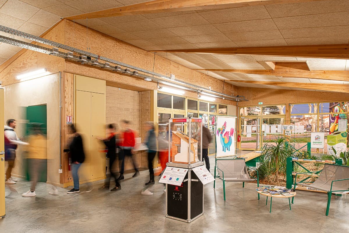 La nouvelle halle repose sur une structure apparente rationnelle, organisée autour de trois volumes chauffés et de zones tampons non conditionnées. Ce dispositif bioclimatique réduit les besoins énergétiques tout en favorisant des usages diversifiés. Les matériaux, locaux et sobres, participent à cette logique d’écoconstruction : bois préfabriqué, briques de terre, isolation biosourcée, finitions brutes. Le réemploi est mis à l’honneur, notamment dans le mobilier, conçu avec des artisans du territoire.