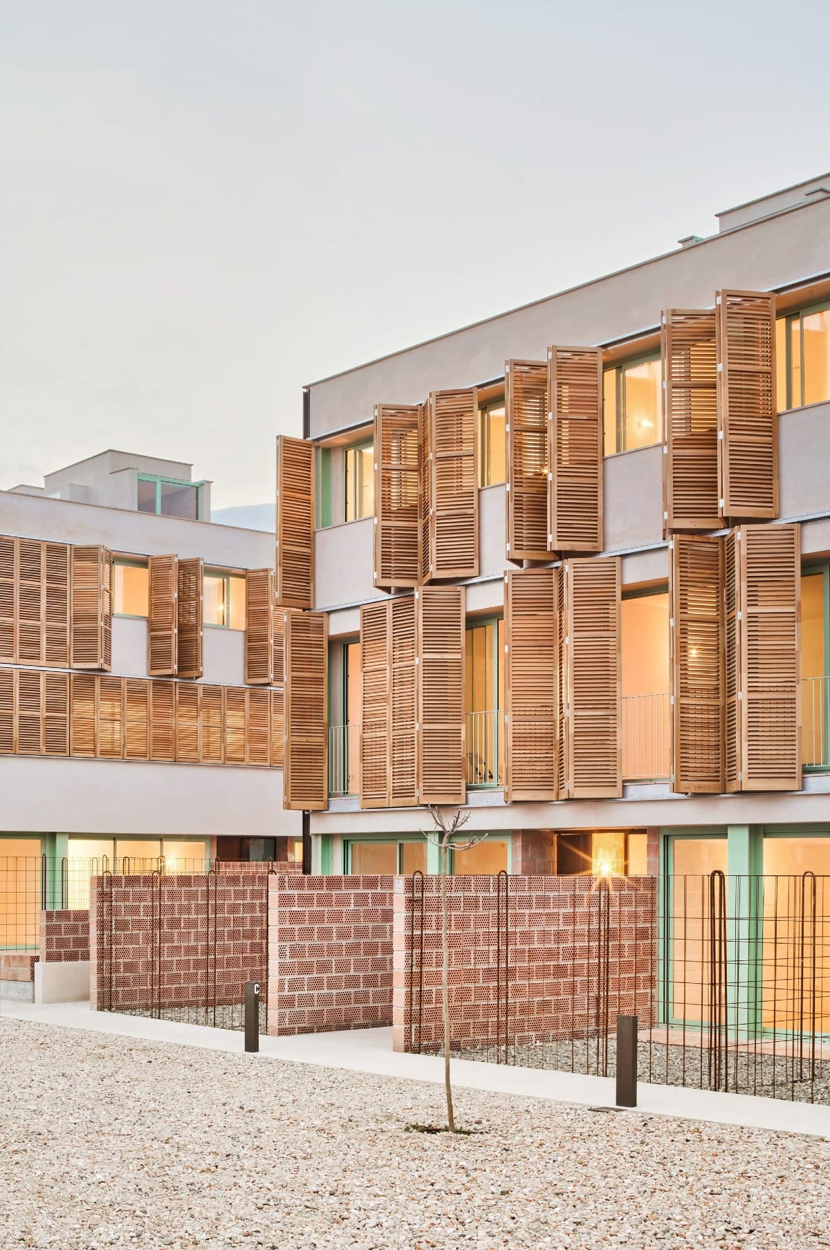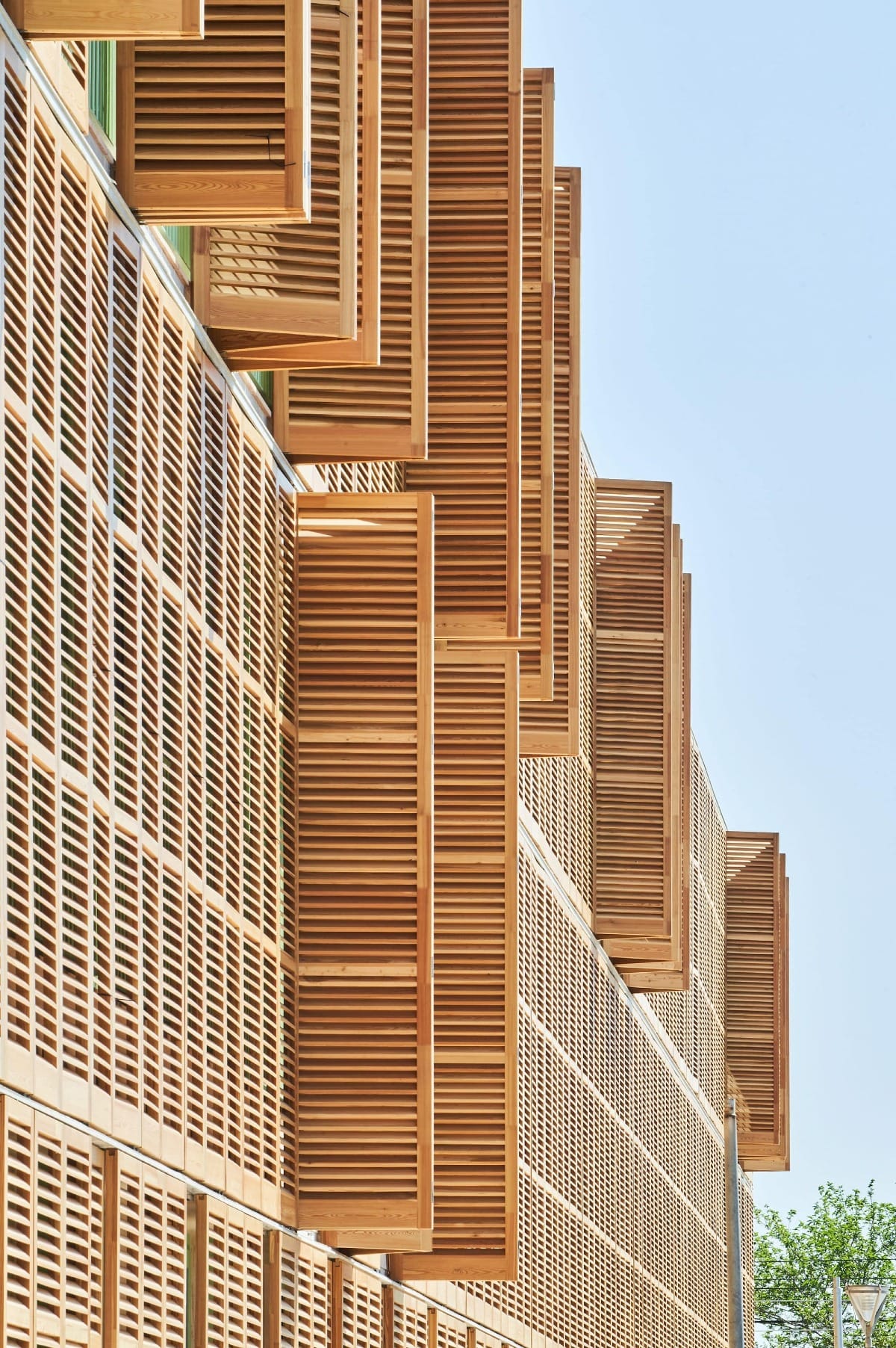 Les unités bénéficient d’espaces extérieurs privés (jardins ou terrasses) et d’une ventilation naturelle efficace. Le système constructif repose sur des dalles réticulaires en béton et des poteaux métalliques, assurant des portées généreuses et une adaptabilité future. La façade associe une isolation performante (liège projeté, coton recyclé) à une peau mobile en bois de mélèze certifié FSC, traité localement. Ces brise-soleil en lames orientables, articulés selon un rythme vertical, créent une vibration en façade et régulent efficacement l’apport solaire.