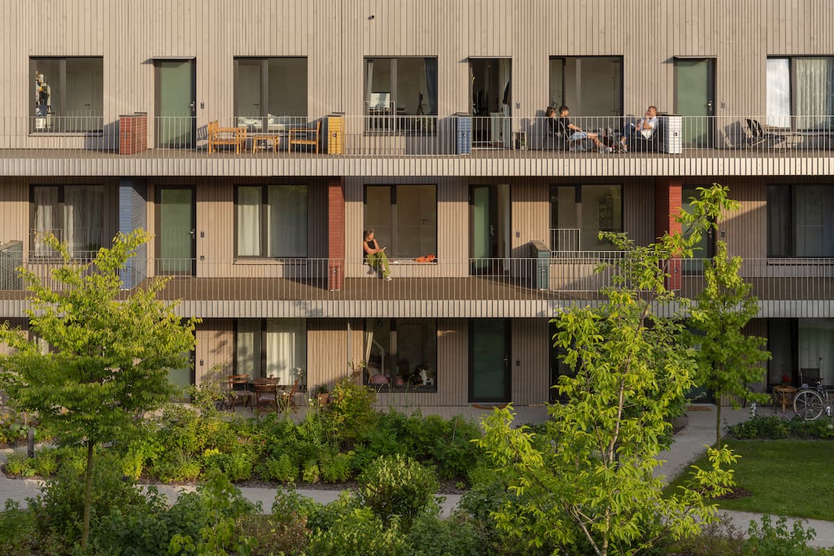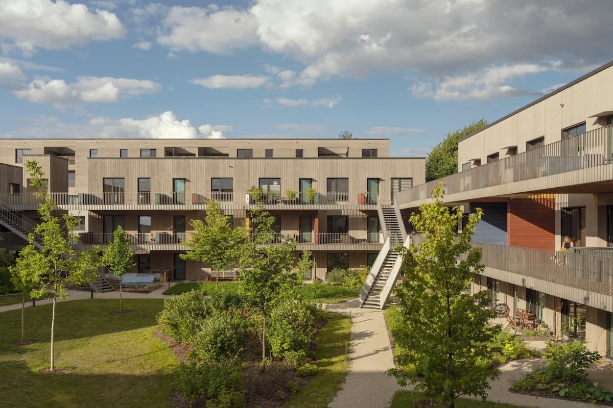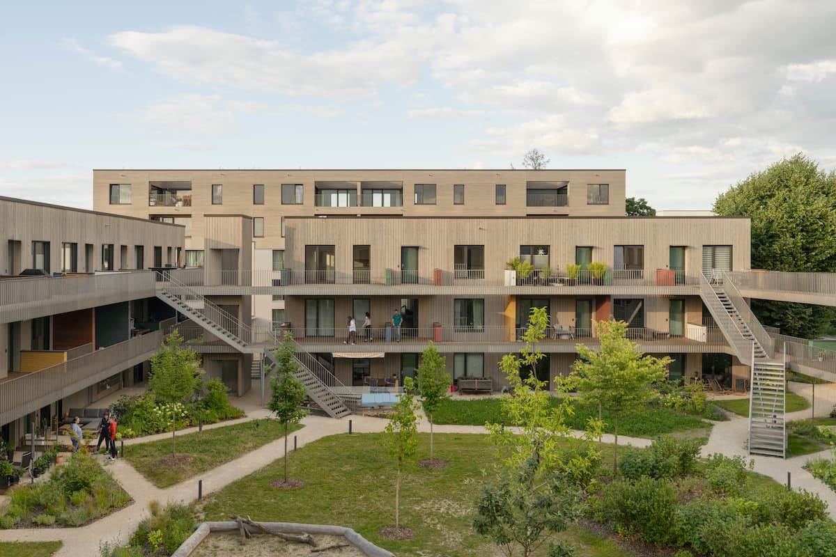 Maîtrise d’ouvrage : Innovatio Projektentwicklung GmbH / Profund GmbH — Architecte : Sauerbruch Hutton — Récompenses : Lauréat du Prix allemand d’architecture 2025 — Programme : Quartier résidentiel en construction bois avec espaces communautaires sociaux, 8 560 m² — Adresse : Berlin, (Allemagne) — Année : 2023 — Crédits photos : Jan Bitter