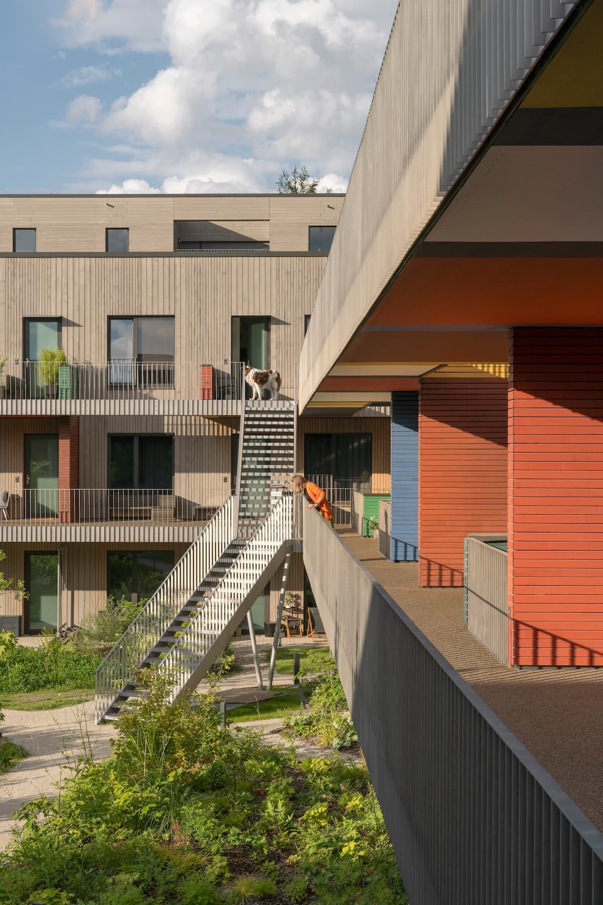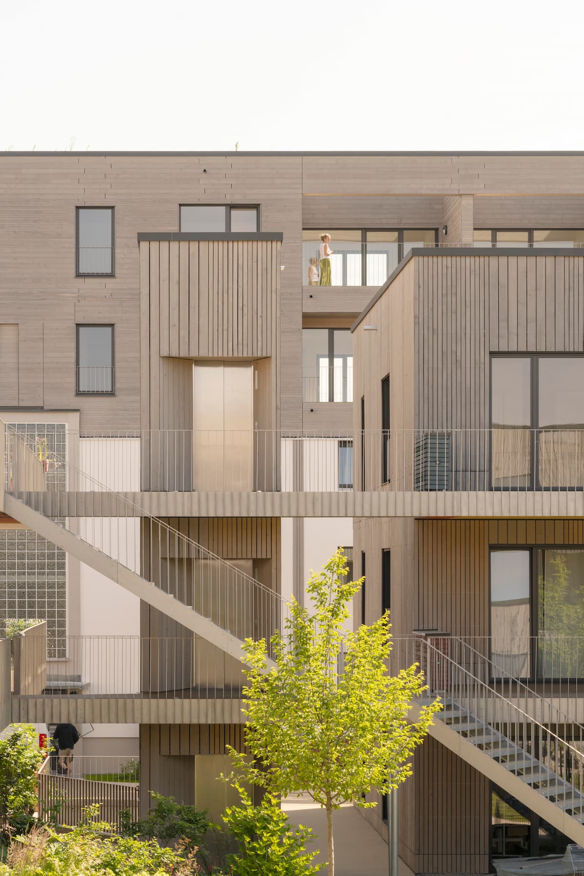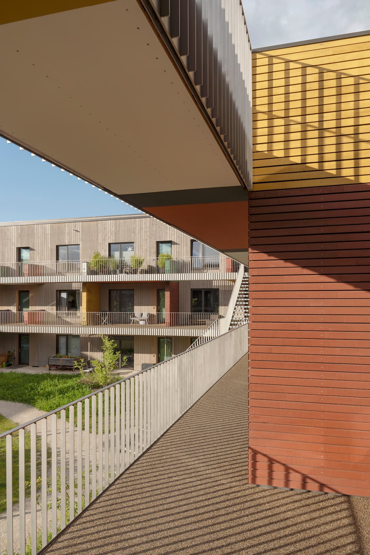 Maîtrise d’ouvrage : Innovatio Projektentwicklung GmbH / Profund GmbH — Architecte : Sauerbruch Hutton — Récompenses : Lauréat du Prix allemand d’architecture 2025 — Programme : Quartier résidentiel en construction bois avec espaces communautaires sociaux, 8 560 m² — Adresse : Berlin, (Allemagne) — Année : 2023 — Crédits photos : Jan Bitter