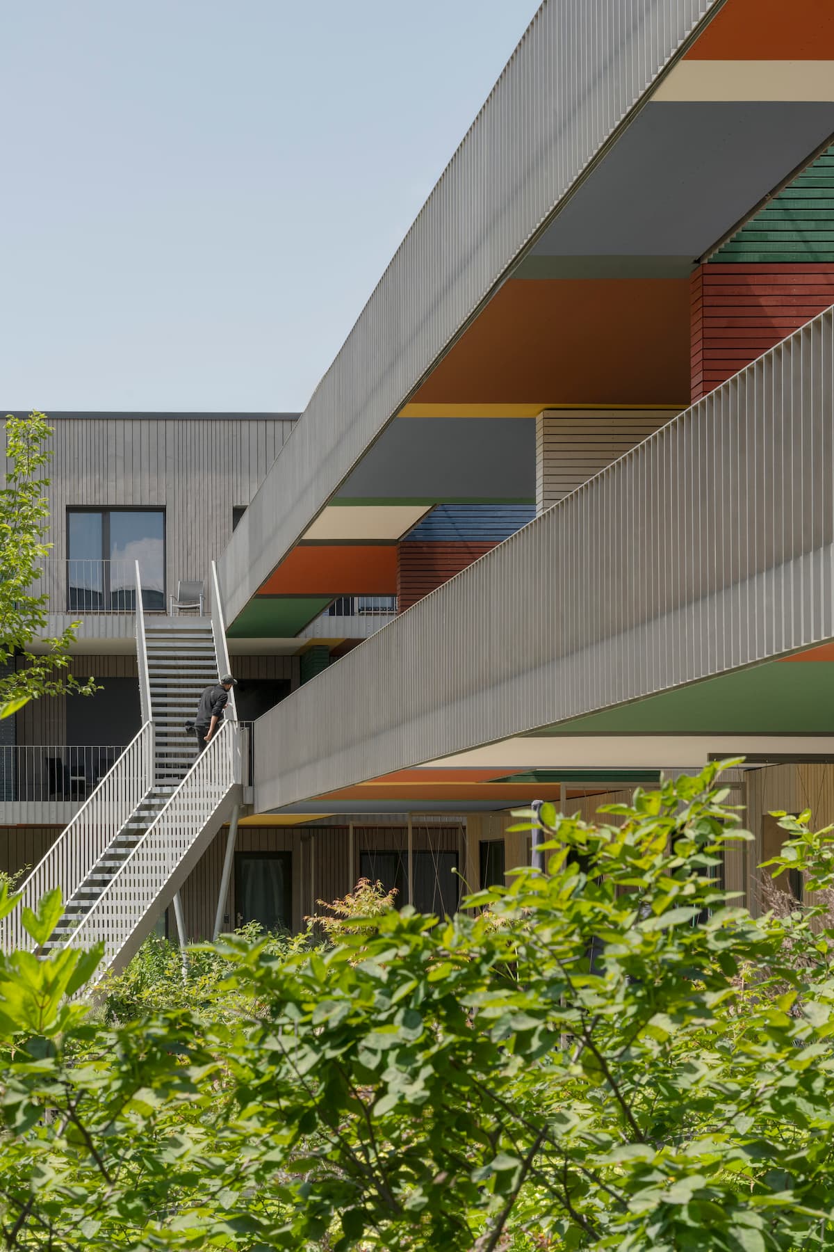 La mixité programmatique se traduit par une grande variété de typologies : du studio individuel à l’habitat en cluster, en passant par des logements familiaux ou partagés. Le projet développe ainsi une réponse architecturale souple à des usages évolutifs. Des passerelles suspendues, véritables structures sociales, relient les bâtiments sans contact au sol. Leurs sous-faces colorées, signature chromatique de l’agence, introduisent une dimension ludique tout en animant la façade. Loin d’un simple dispositif de circulation, ces plateformes deviennent des lieux d’appropriation collective.