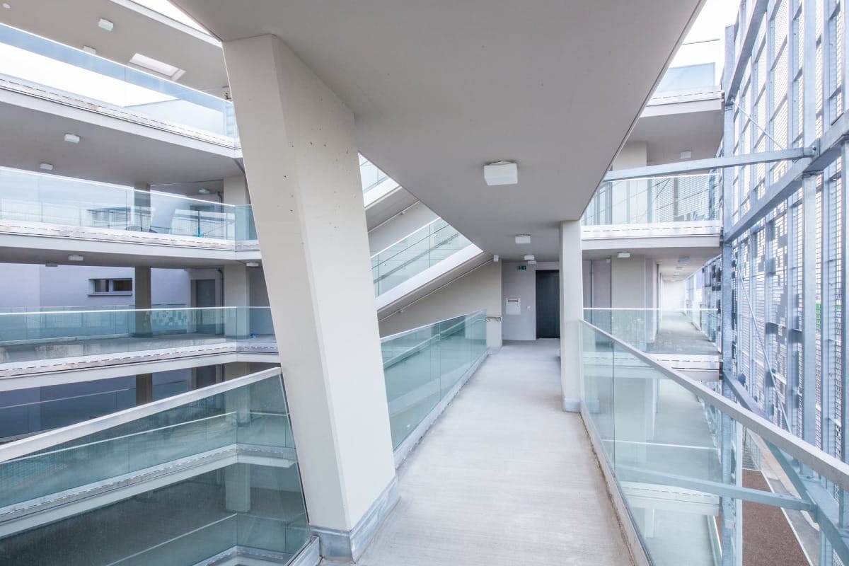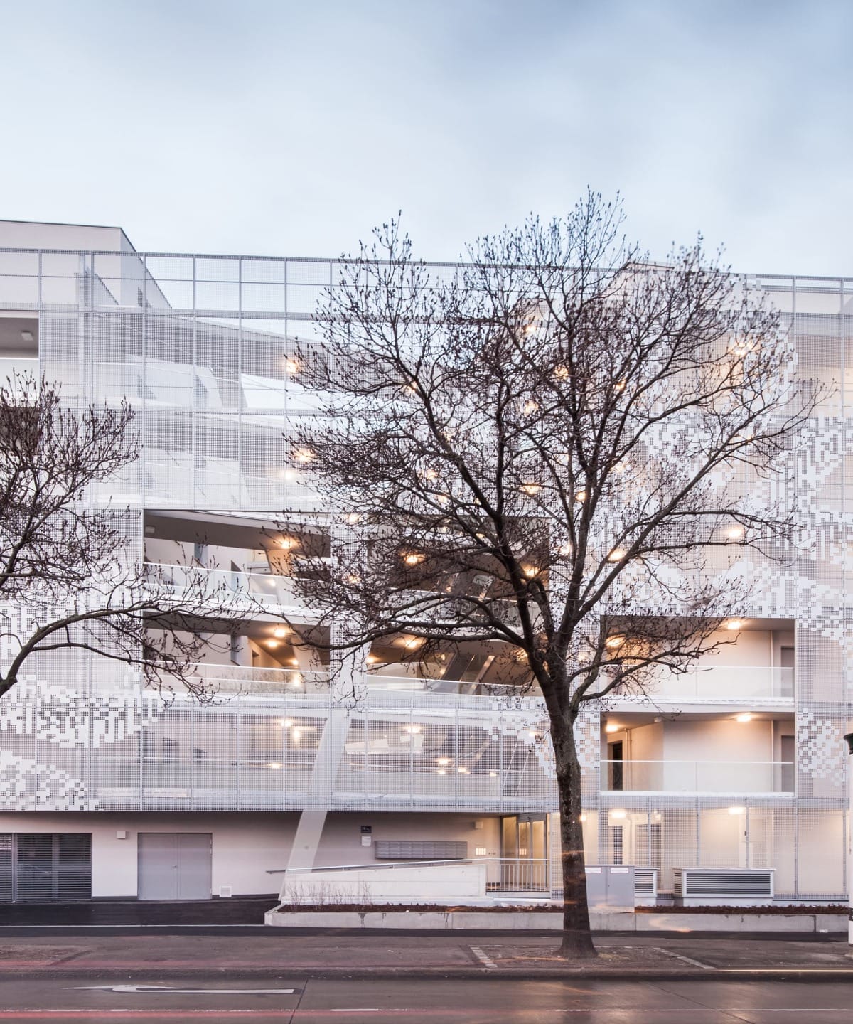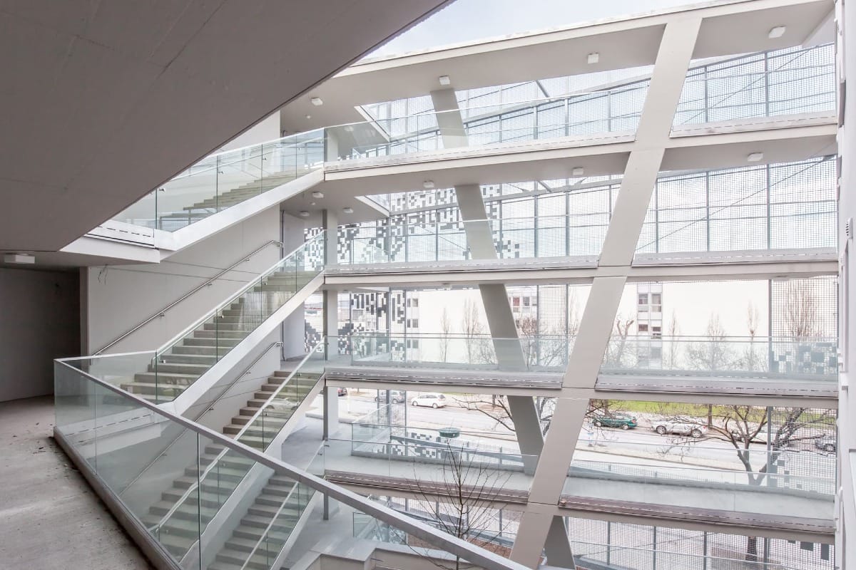 L’organisation architecturale privilégie flexibilité et modularité : cuisines ouvertes, pièces traversantes et logements combinables permettent une adaptabilité fine aux évolutions familiales. Les façades dialoguent avec l’environnement : un treillis métallique filtre les vues depuis la rue, des loggias animent les volumes sur cour, et les ouvertures sculptées cadencent les perceptions. Cette composition rigoureuse affiche une matérialité sobre, pensée pour durer.
